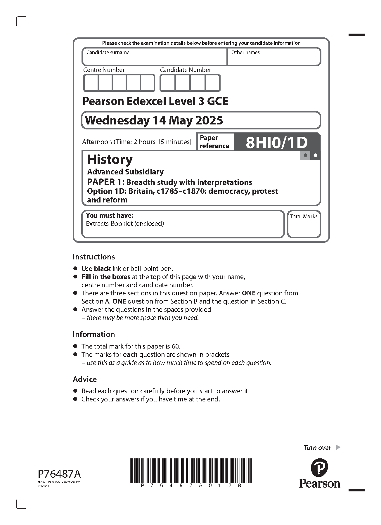 2025 Pearson Edexcel AS Level History Paper 1 and Mark Scheme Combined (8HI0/1D: Britain, c1785–c1870: democracy, protest and reform)