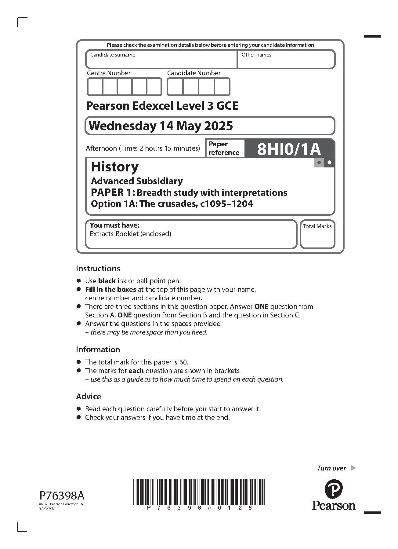 2025 Pearson Edexcel AS Level History Paper 1 and Mark Scheme Combined (8HI0/1A: The crusades, c1095–1204)