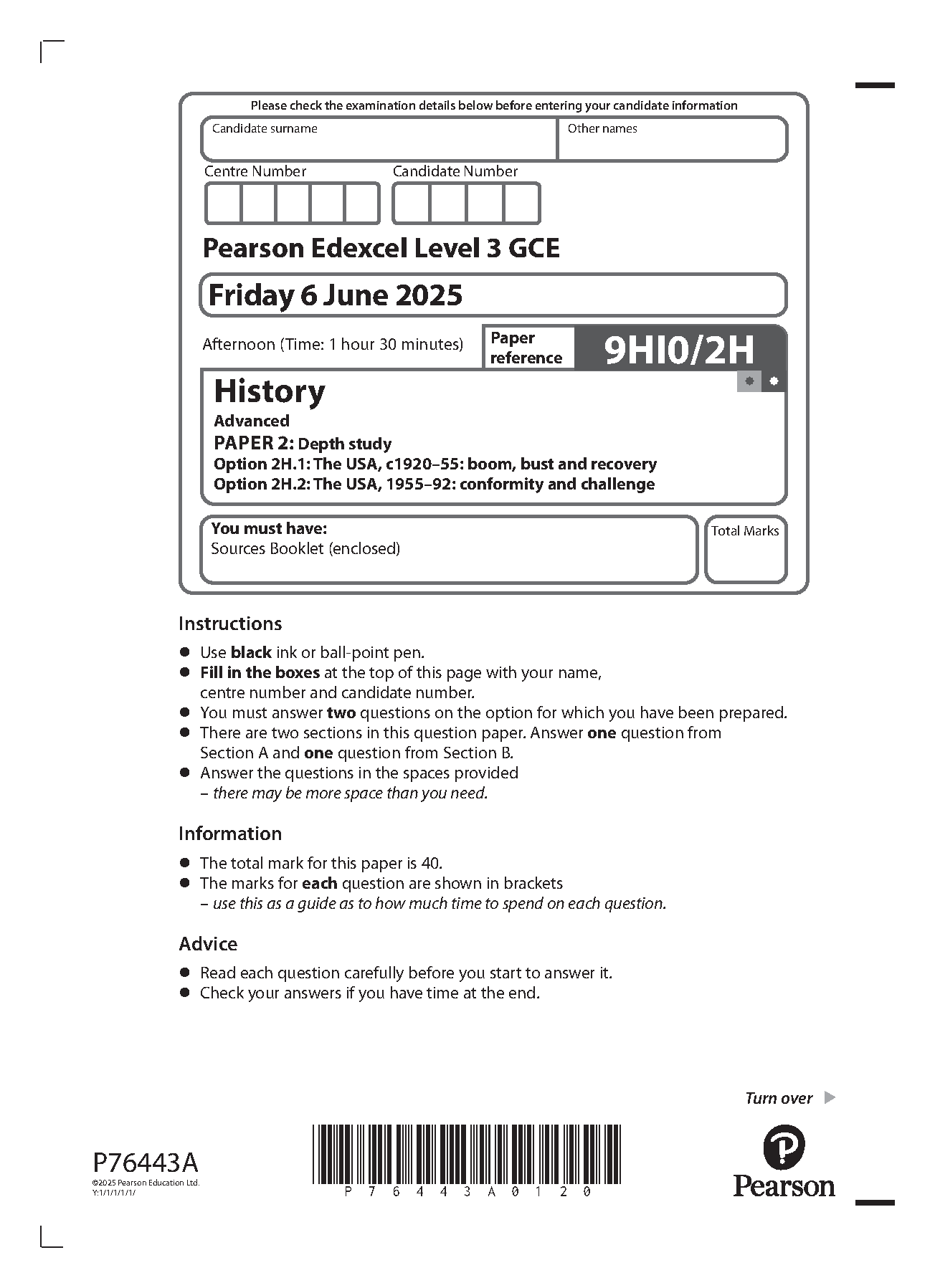 2025 Pearson Edexcel A Level History PAPER 2 and Mark Scheme Combined (9HI0/2H: Depth study)