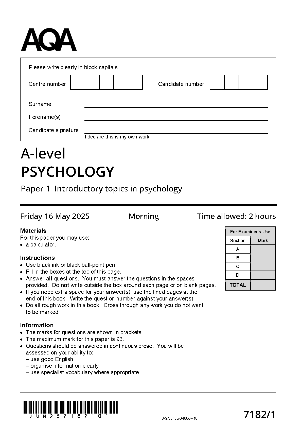 AQA A LEVEL PSYCHOLOGY PAPER 1 2025 (7182/1)
