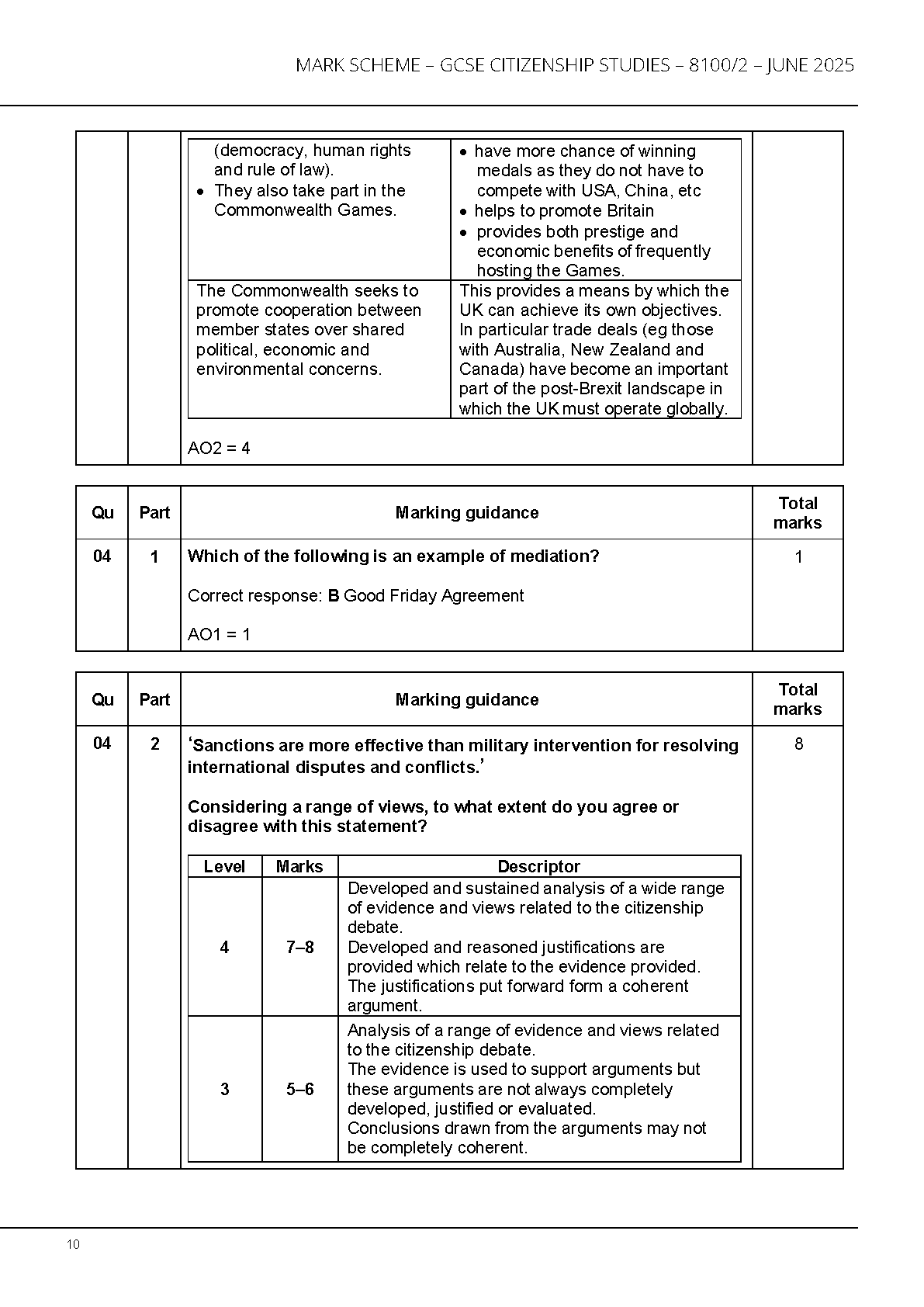 AQA GCSE CITIZENSHIP STUDIES PAPER 2 2025 MARK SCHEME