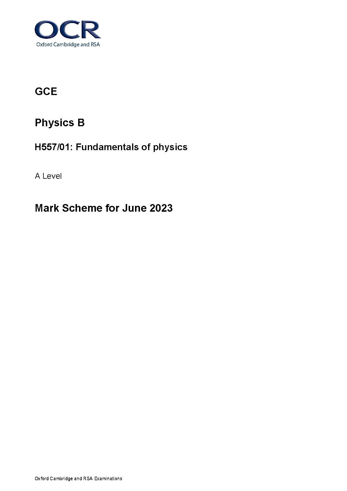 OCR A LEVEL Physics B H557/01: Fundamentals of physics 2023 MARK SCHEME. OCR A LEVEL Physics B H557/01: Fundamentals of physics 2023 MARK SCHEME A-Level Mark Scheme