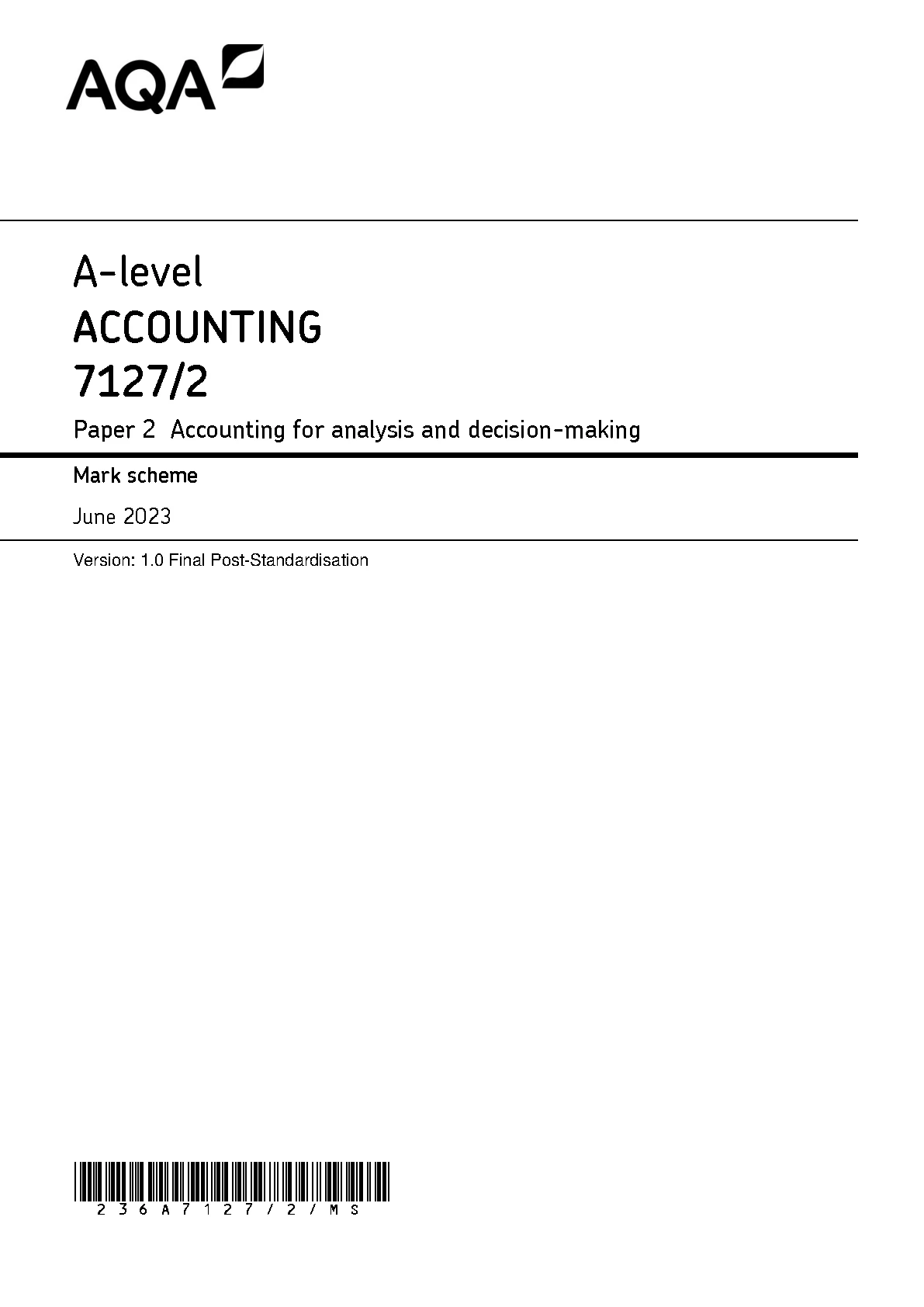 AQA A LEVEL ACCOUNTING MARK SCHEME PAPER 2 2023 [7127/2: Accounting for analysis and decision-making]. AQA A LEVEL ACCOUNTING MARK SCHEME PAPER 2 2023 [7127/2: Accounting for analysis and decision-making] A-Level Mark Scheme