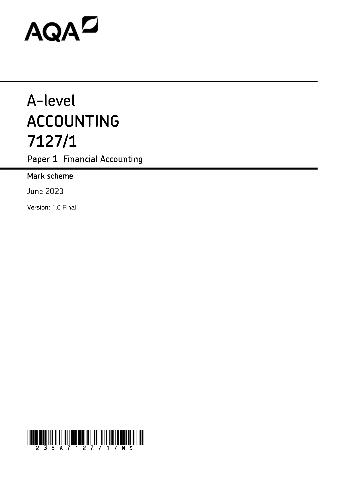 AQA A LEVEL ACCOUNTING MARK SCHEME PAPER 1 2023 [7127/1: Financial Accounting]. AQA A LEVEL ACCOUNTING MARK SCHEME PAPER 1 2023 [7127/1: Financial Accounting] A-Level Mark Scheme