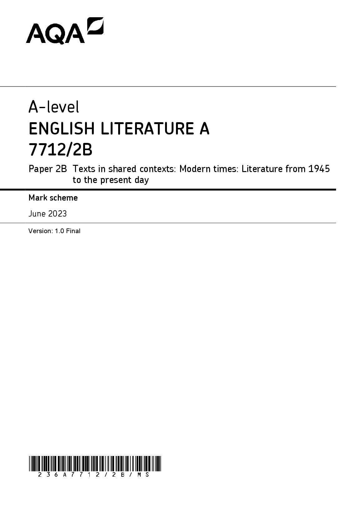 AQA A LEVEL ENGLISH LITERATURE A MARKSCHEME PAPER 2B (7712/2B;Texts in shared contexts: Modern times: Literature from 1945 to the present day). AQA A LEVEL ENGLISH LITERATURE A MARKSCHEME PAPER 2B (7712/2B;Texts in shared contexts: Modern times: Literature from 1945 to the present day) A-Level Mark Scheme