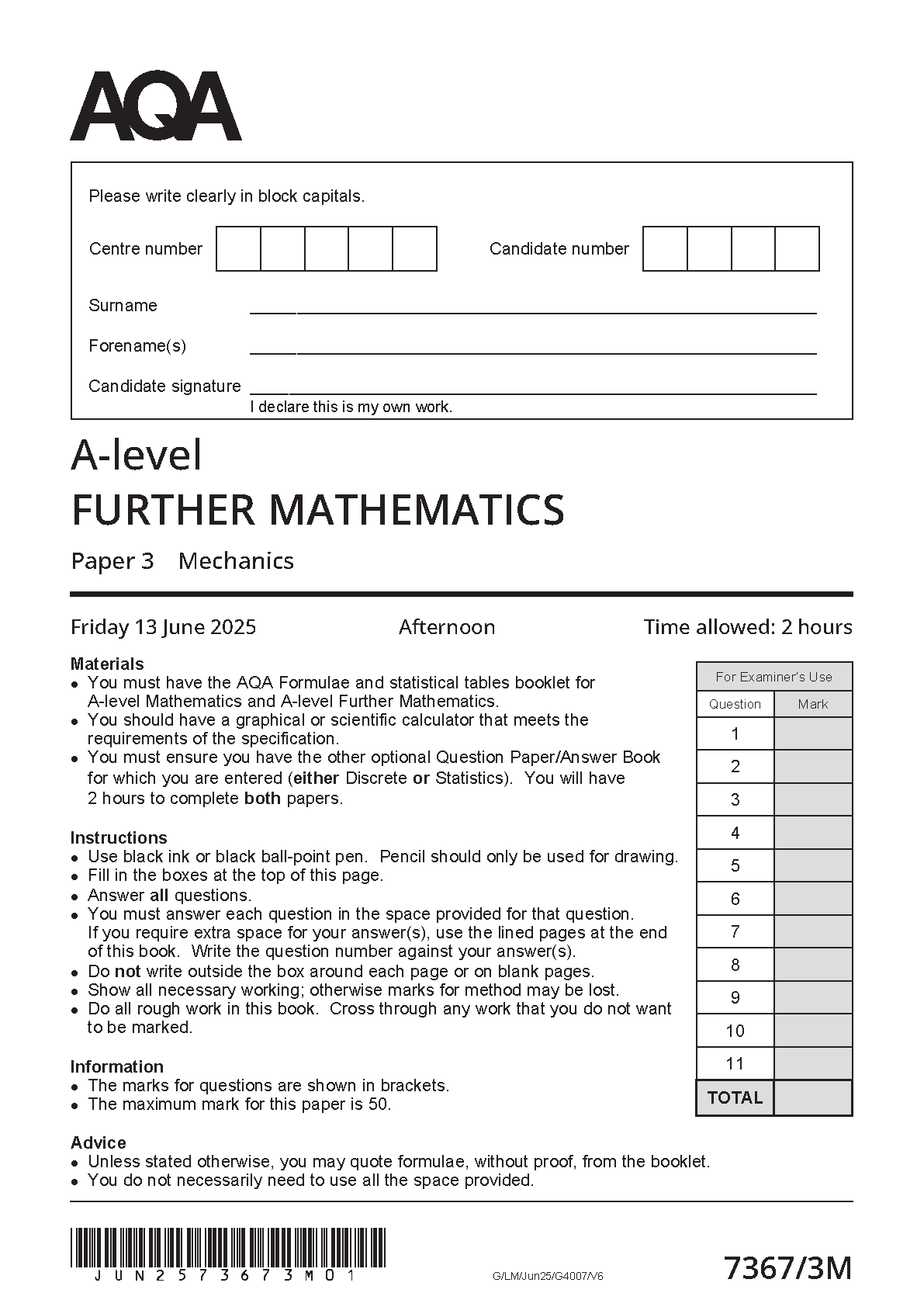 aqa a level further mathematics paper 3m 2025 (7367/3m: mechanics). download this verified paper on www.leakedexams.com...