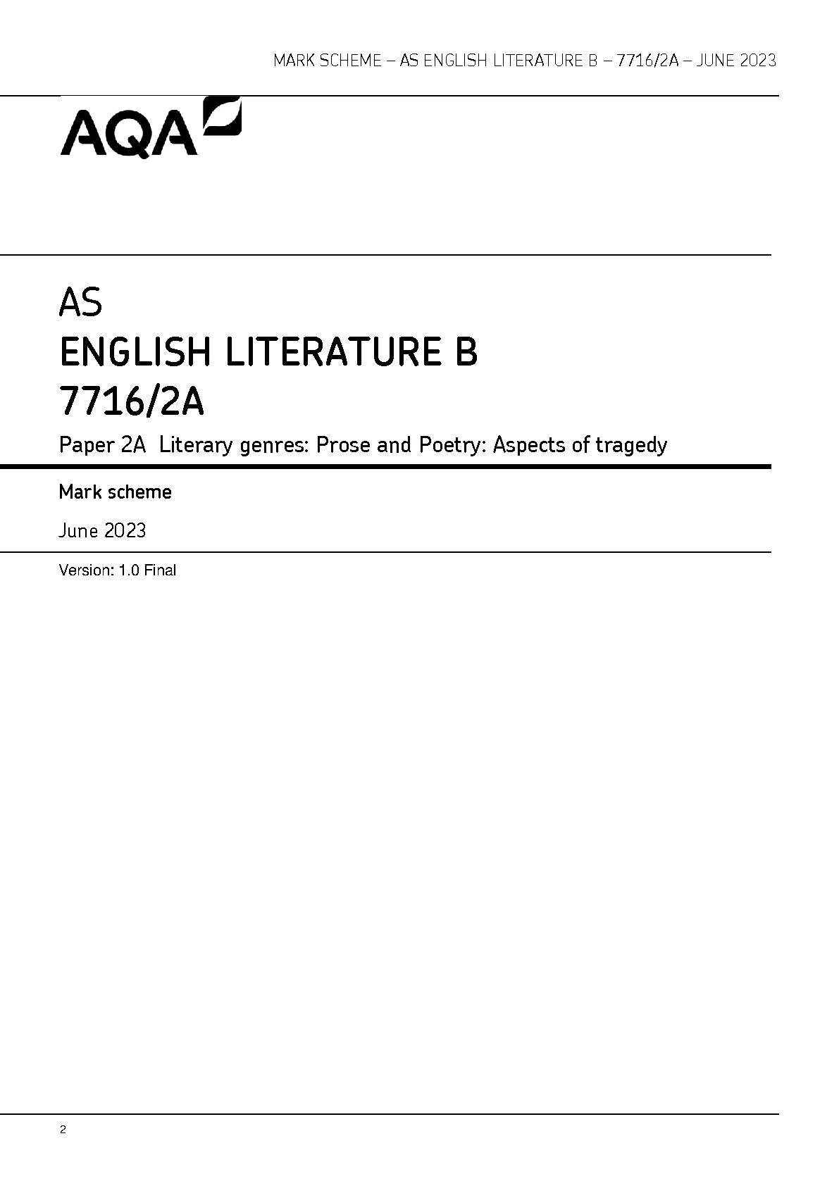 AQA AS ENGLISH LITERATURE B MARKSCHEME PAPER 2A 2023 (7716/2A;Literary genres:Prose and Poetry:Aspects of tragedy). AQA AS ENGLISH LITERATURE B MARKSCHEME PAPER 2A 2023 (7716/2A;Literary genres:Prose and Poetry:Aspects of tragedy) AS Mark Scheme