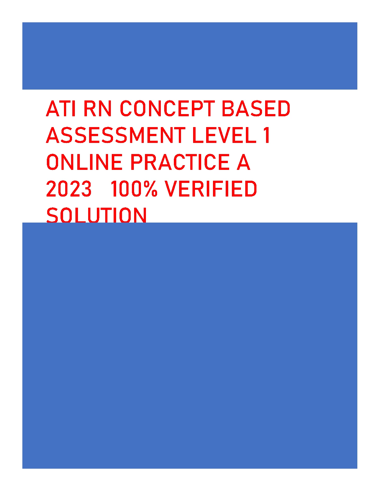 ATI RN CONCEPT BASED ASSESSMENT LEVEL 1 ONLINE PRACTICE A 2023 100% VERIFIED SOLUTION. ATI RN CONCEPT BASED ASSESSMENT LEVEL 1 ONLINE PRACTICE A 2023 100% VERIFIED SOLUTION ATI