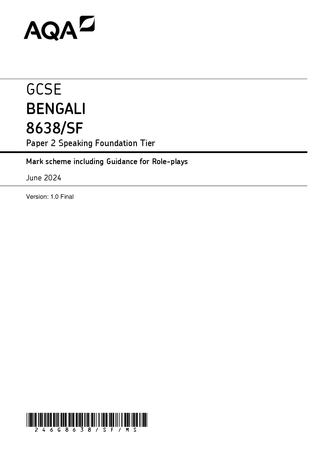 2024 AQA GCSE BENGALI Paper 2 Speaking MARK SCHEME(8638/SF:Foundation Tier). 2024 AQA GCSE BENGALI Paper 2 Speaking MARK SCHEME(8638/SF:Foundation Tier) GCSE MARK SCHEME