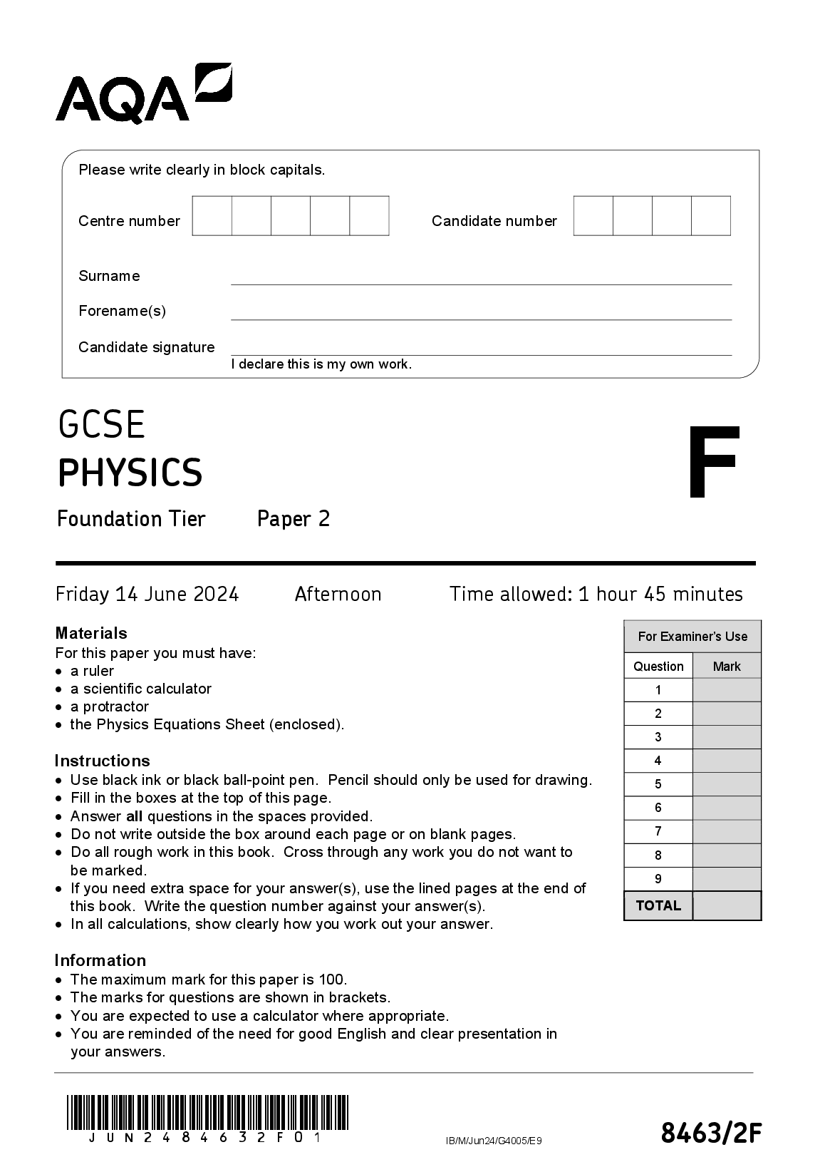 2024 AQA GCSE PHYSICS PAPER 2 QP(8463/2F:FOUNDATION TIER). 2024 AQA GCSE PHYSICS PAPER 2 QP(8463/2F:FOUNDATION TIER) GCSE QUESTION PAPER