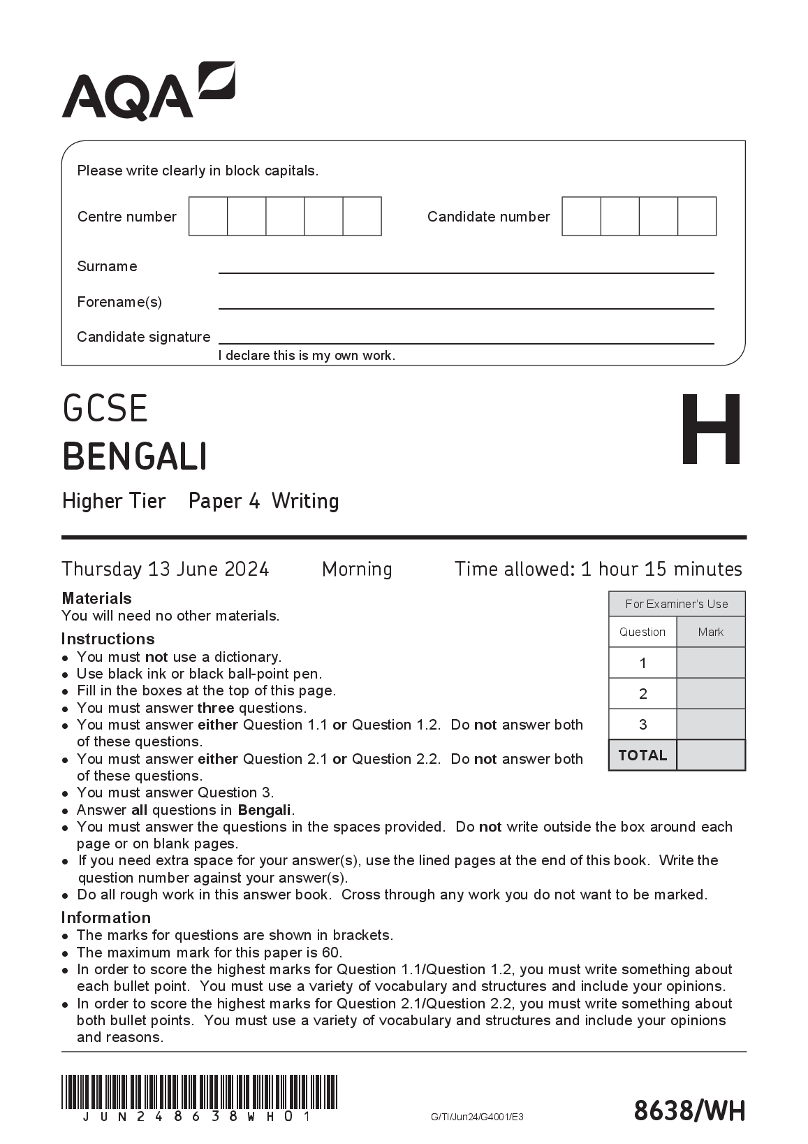 2024 aqa gcse bengali paper 4 writing qp(8638/wh:higher tier)