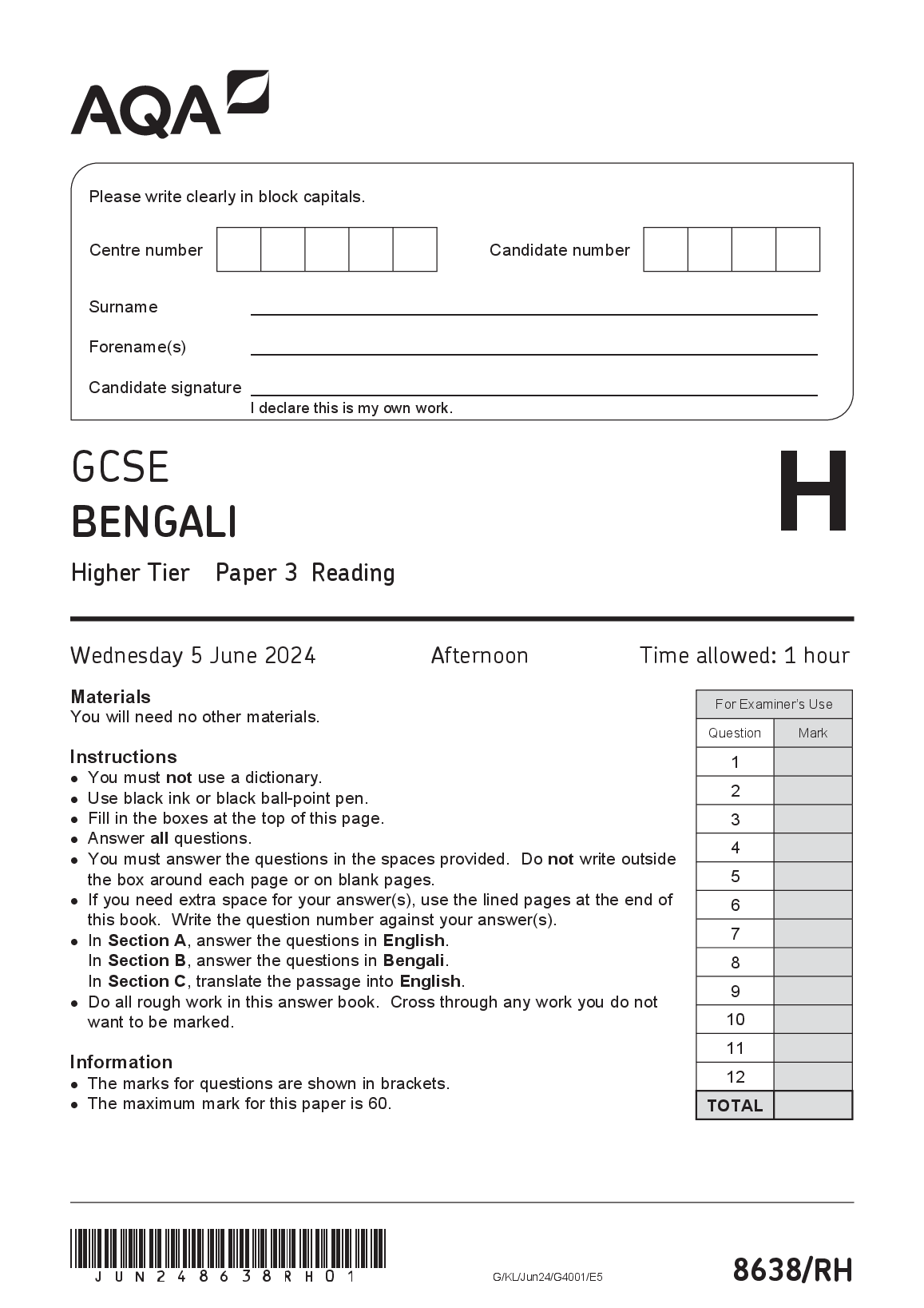 2024 AQA GCSE BENGALI Paper 3 Reading QP(8638/RH:Higher Tier). 2024 AQA GCSE BENGALI Paper 3 Reading QP(8638/RH:Higher Tier) GCSE QUESTION PAPER