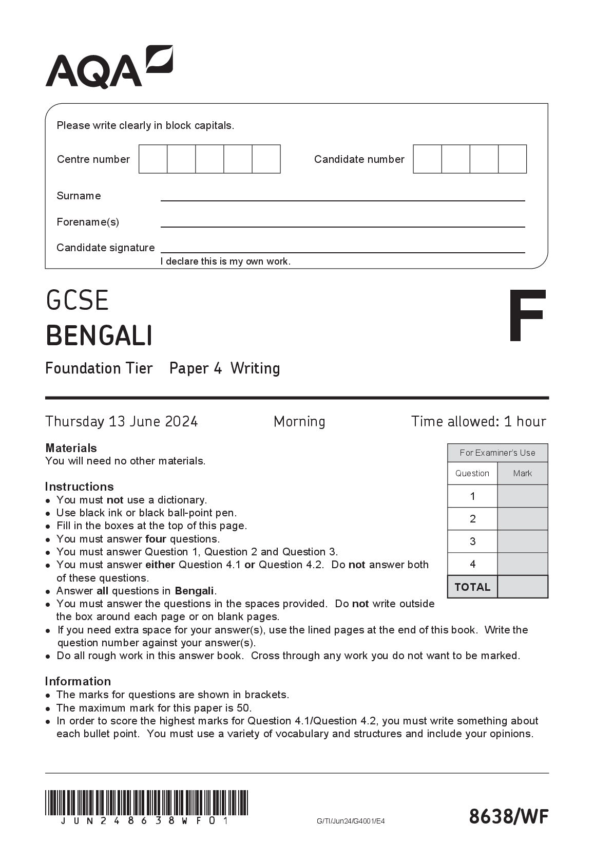 2024 AQA GCSE BENGALI Paper 4 Writing QP(8638/WF:Foundation Tier). 2024 AQA GCSE BENGALI Paper 4 Writing QP(8638/WF:Foundation Tier) GCSE QUESTION PAPER