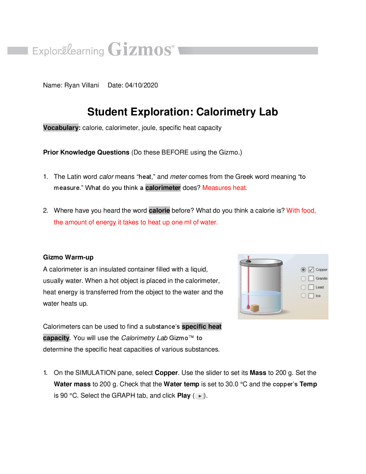 gizmos student exploration_calorimetry lab: vocabulary: calorie, calorimeter, joule, specific heat capacity 2024 verifie...