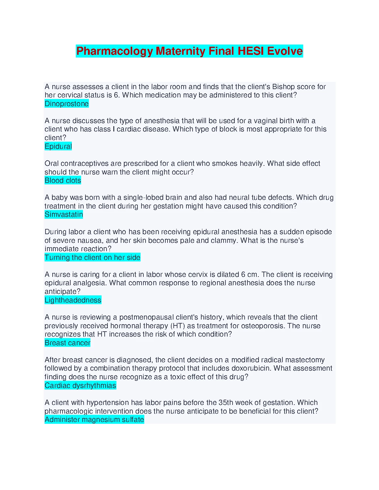 Pharmacology Maternity Final HESI Evolve 2024. Pharmacology Maternity Final HESI Evolve 2024 HESI MED SURG