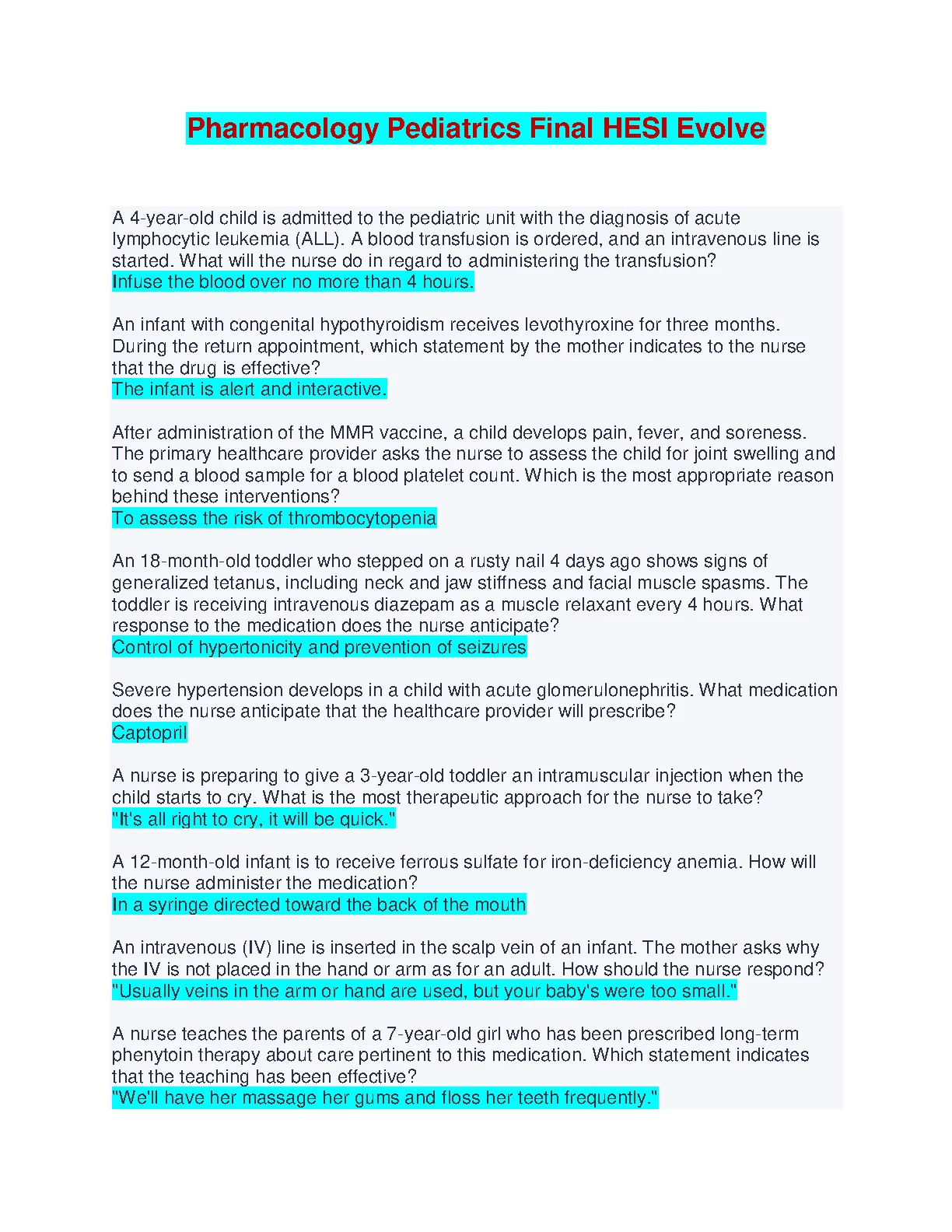 Pharmacology Pediatrics Final HESI Evolve 2024 Edition. Pharmacology Pediatrics Final HESI Evolve 2024 Edition HESI MED SURG