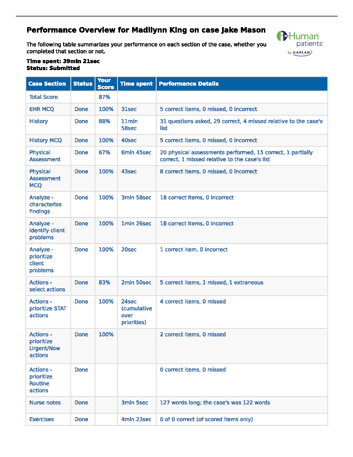 analyze madilynn king's performance on the ihuman patients case study, 'jake mason'. this detailed overview provides a c...