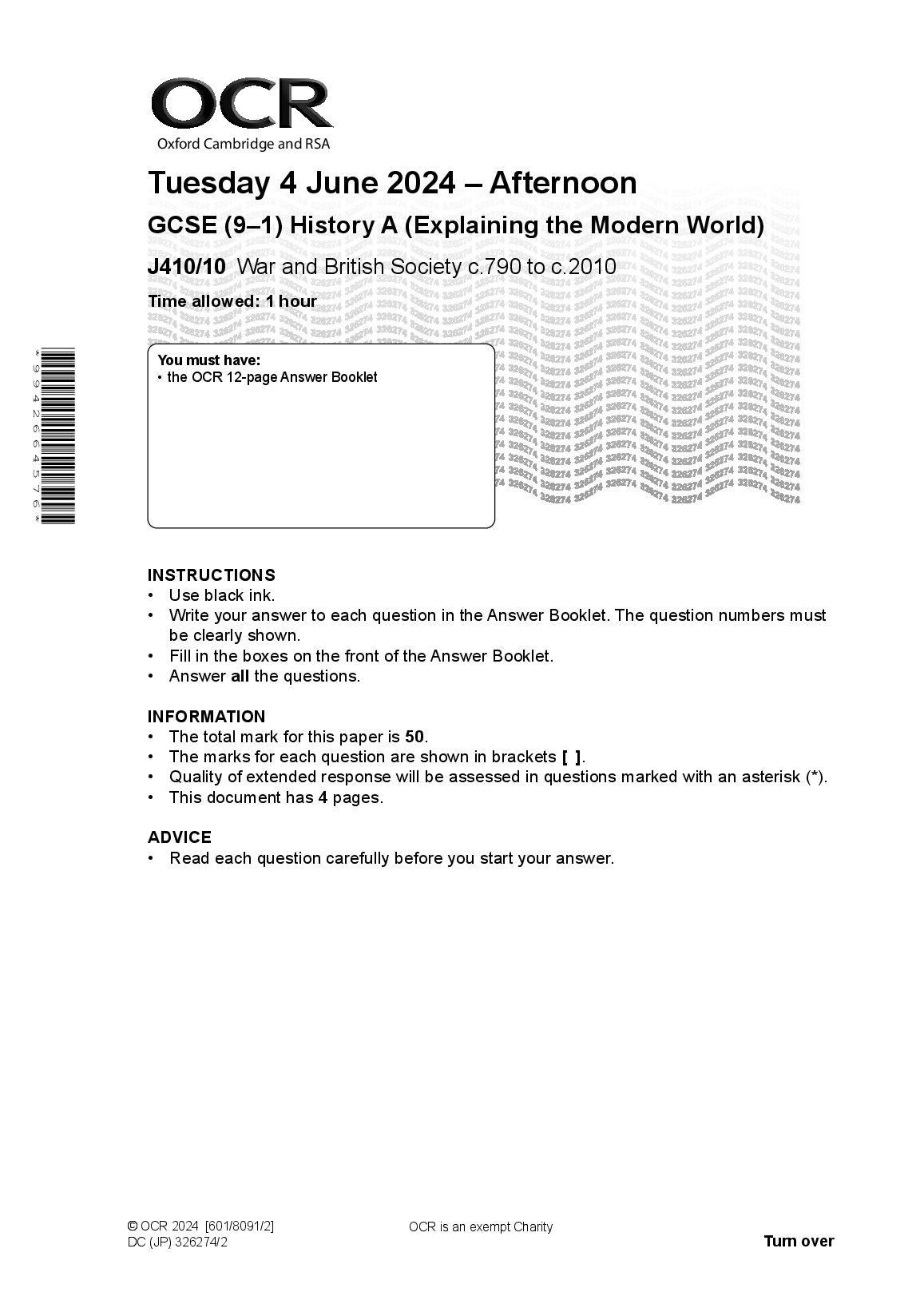 2024 OCR GCSE History A Paper 10 (J410/10: War and British Society c.790 to c.2010). 2024 OCR GCSE History A Paper 10 (J410/10: War and British Society c.790 to c.2010) OCR GCSE Papers & mark schemes