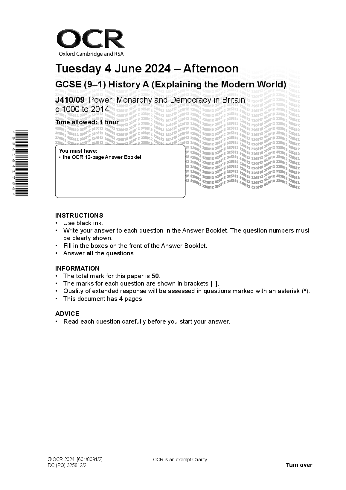 2024 OCR GCSE History A Paper 9 (J410/09 Power: Monarchy and Democracy in Britain c.1000 to 2014). 2024 OCR GCSE History A Paper 9 (J410/09 Power: Monarchy and Democracy in Britain c.1000 to 2014) OCR GCSE Papers & mark schemes