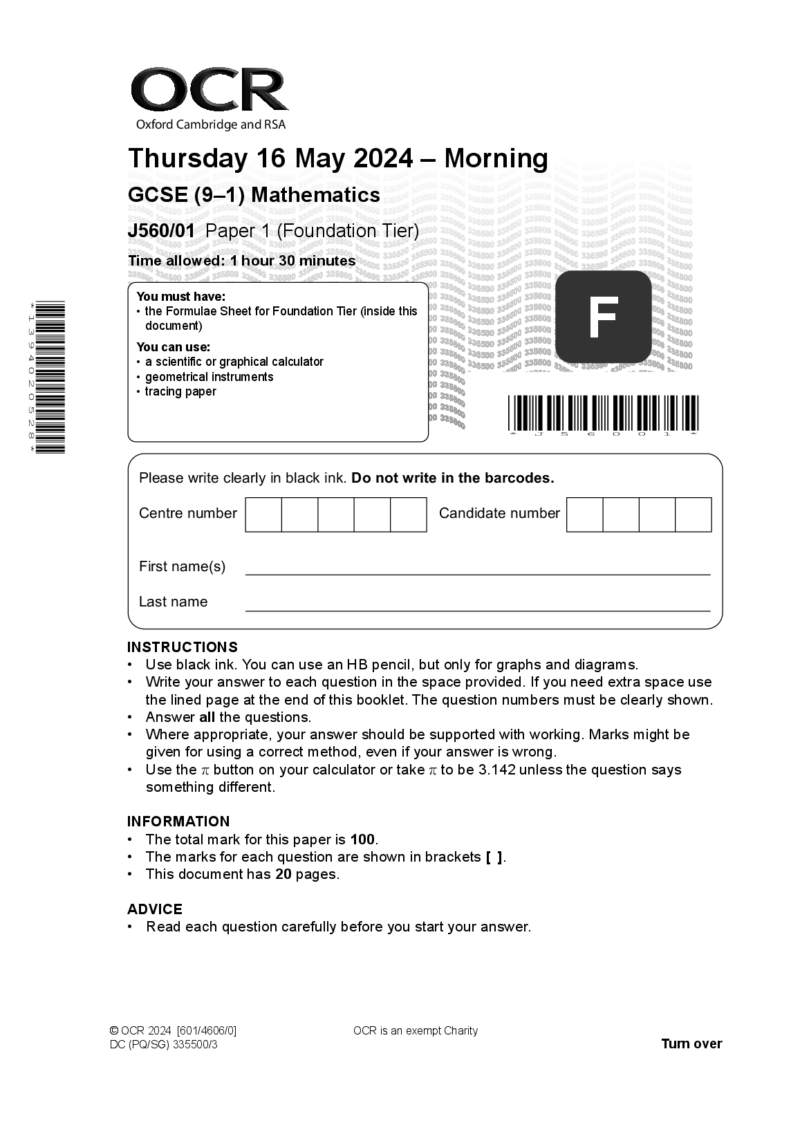 2024 OCR GCSE Mathematics Paper 1 (J560/01: Foundation Tier). 2024 OCR GCSE Mathematics Paper 1 (J560/01: Foundation Tier) OCR GCSE Papers & mark schemes