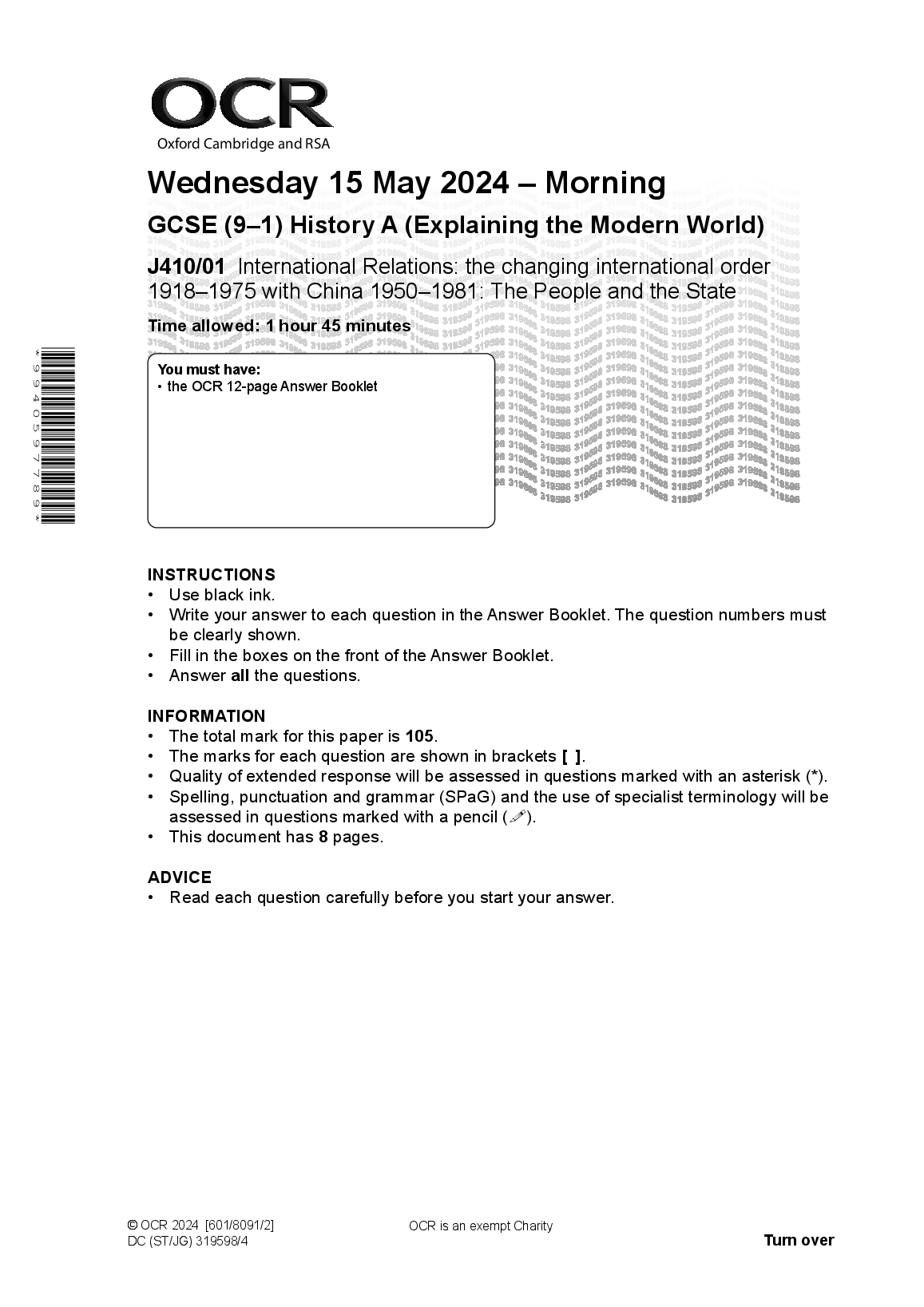 2024 OCR GCSE History A Paper 1 (J410/01 :International Relations: the changing international order 1918–1975 with China 1950–1981: The People and the State). 2024 OCR GCSE History A Paper 1 (J410/01 :International Relations: the changing international order 1918–1975 with China 1950–1981: The People and the State) OCR GCSE Papers & mark schemes