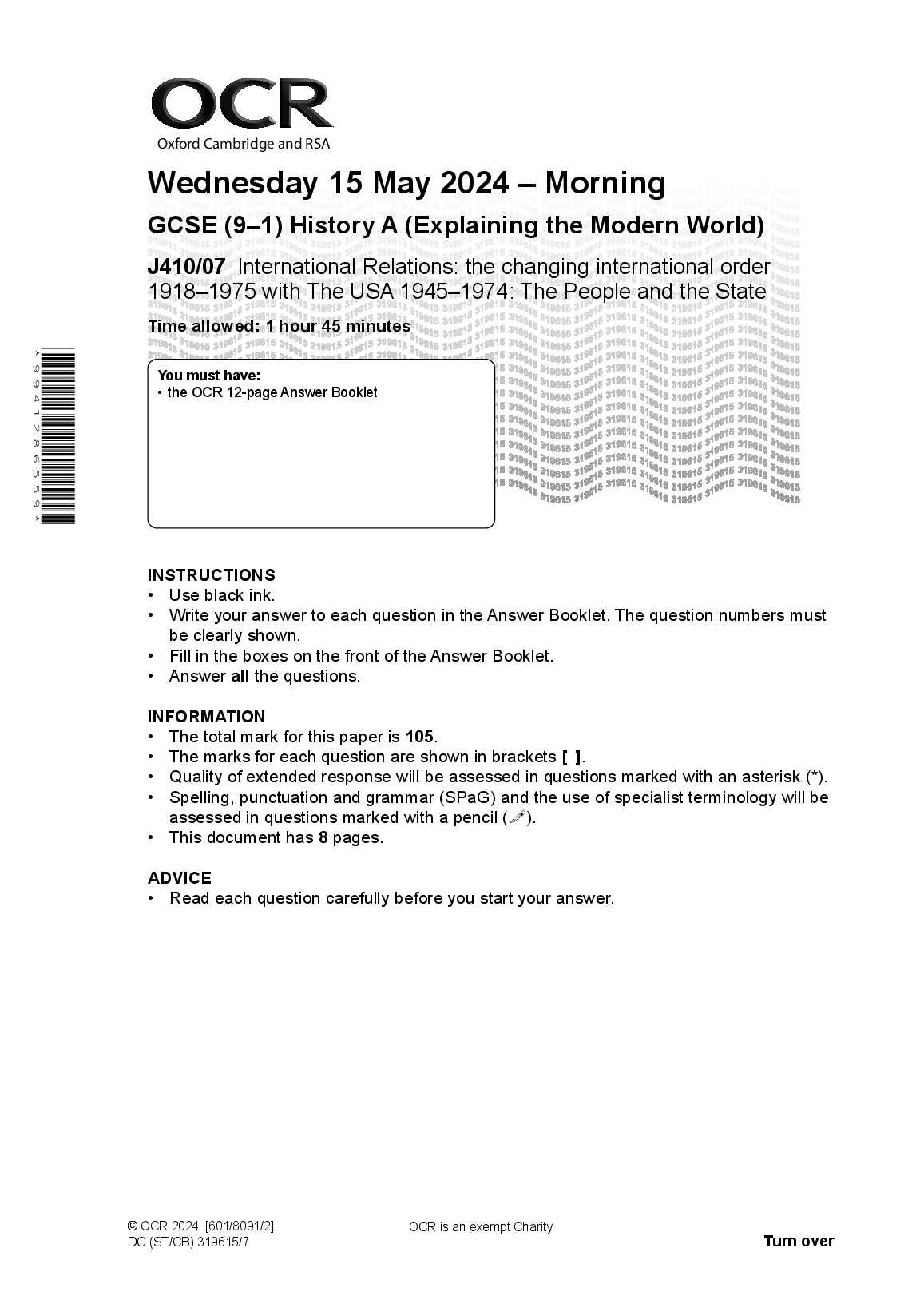 2024 OCR GCSE History A Paper 7 (J410/07: International Relations: the changing international order 1918–1975 with The USA 1945–1974: The People and the State). 2024 OCR GCSE History A Paper 7 (J410/07: International Relations: the changing international order 1918–1975 with The USA 1945–1974: The People and the State) OCR GCSE Papers & mark schemes