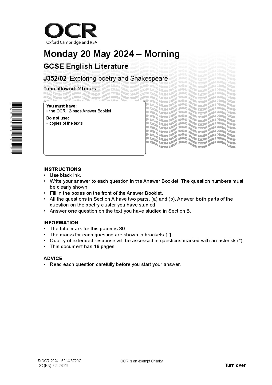 2024 OCR GCSE English Literature Paper 2 (J352/02: Exploring poetry and Shakespeare ). 2024 OCR GCSE English Literature Paper 2 (J352/02: Exploring poetry and Shakespeare ) OCR GCSE Papers & mark schemes