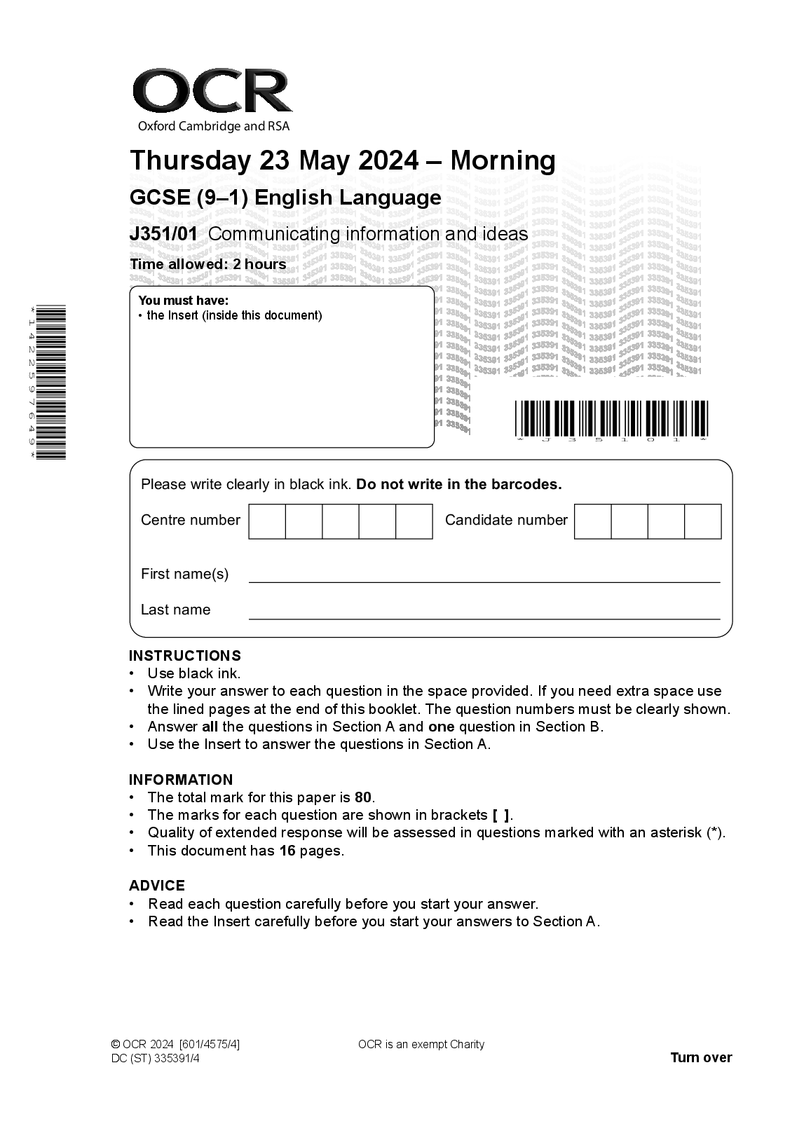 2024 OCR GCSE English Language Paper 1 (J351/01: Communicating information and ideas). 2024 OCR GCSE English Language Paper 1 (J351/01: Communicating information and ideas) OCR GCSE Papers & mark schemes