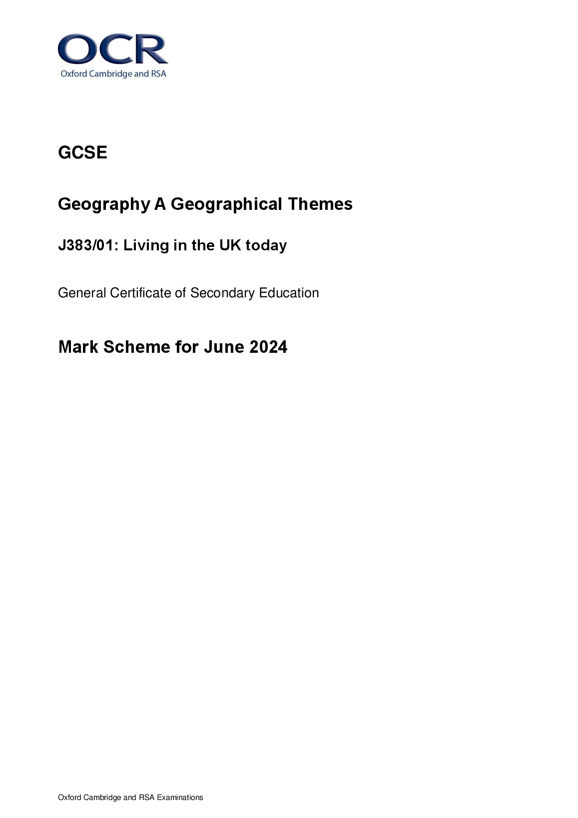 2024 OCR GCSE Geography A Geographical Themes Mark Scheme Paper 1 (J383/01: Living in the UK today). 2024 OCR GCSE Geography A Geographical Themes Mark Scheme Paper 1 (J383/01: Living in the UK today) OCR GCSE Question Papers and Mark Schemes