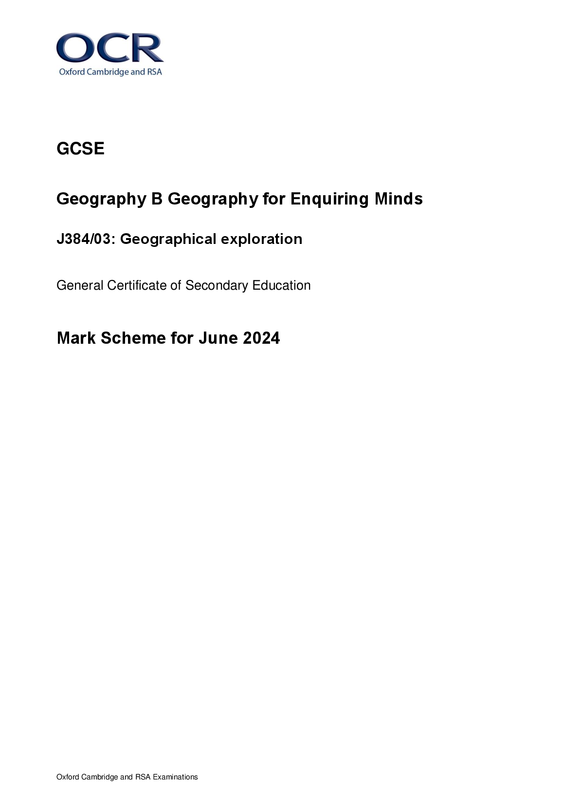 2024 OCR GCSE Geography B Geography for Enquiring Minds Mark Scheme Paper 3 (J384/03: Geographical exploration). 2024 OCR GCSE Geography B Geography for Enquiring Minds Mark Scheme Paper 3 (J384/03: Geographical exploration) OCR GCSE Question Papers and Mark Schemes