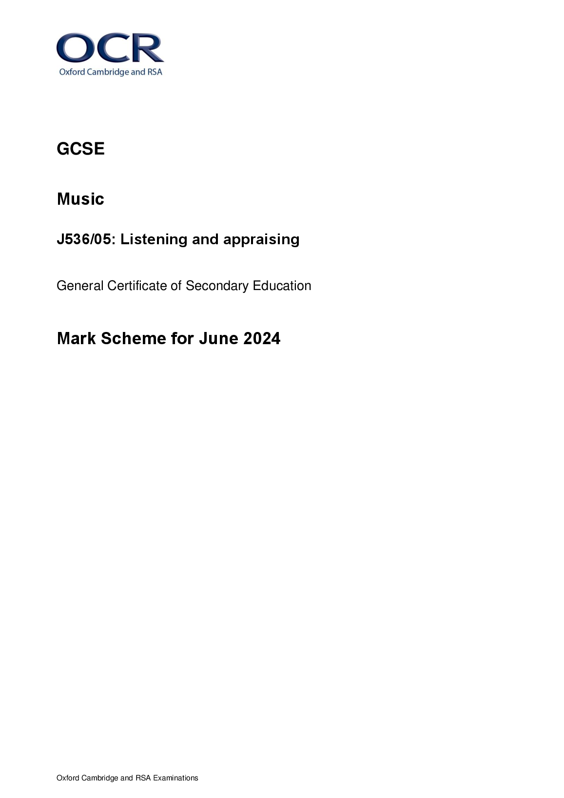 2024 OCR GCSE Music Mark Scheme Paper 5 (J536/05: Listening and appraising). 2024 OCR GCSE Music Mark Scheme Paper 5 (J536/05: Listening and appraising) OCR GCSE Question Papers and Mark Schemes
