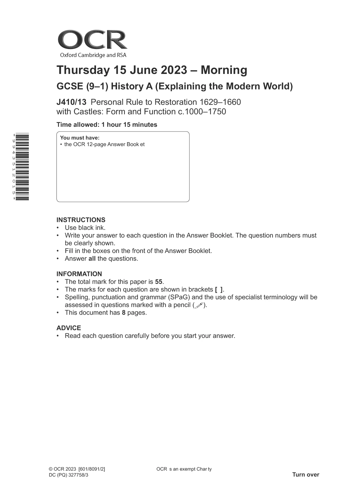 OCR GCSE HISTORY A PAPER 13 QUESTION PAPER 2023 (J410/13: Personal rule to Restoration 1629-1660 with castles: form and function c.1000-1750). OCR GCSE HISTORY A PAPER 13 QUESTION PAPER 2023 (J410/13: Personal rule to Restoration 1629-1660 with castles: form and function c.1000-1750) OCR GCSE Question Papers and Mark Schemes