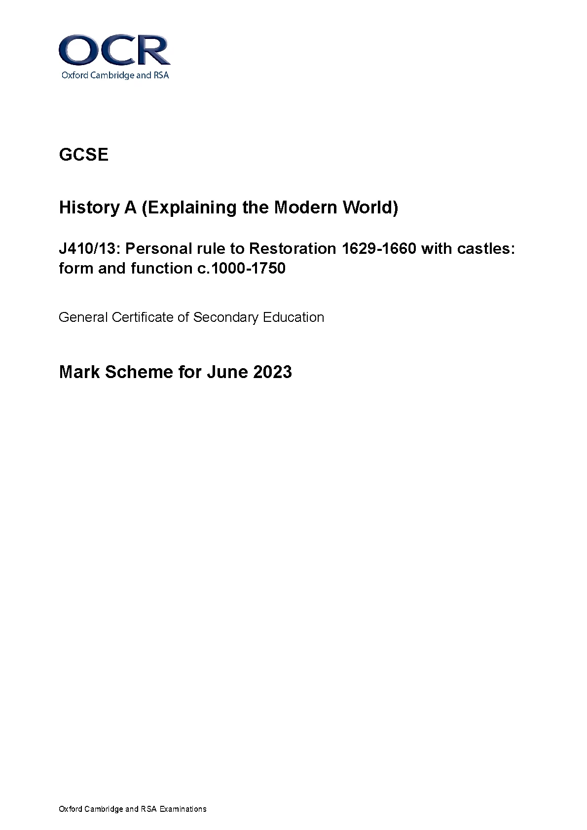 OCR GCSE HISTORY A PAPER 13 MARK SCHEME 2023 (J410/13: Personal rule to Restoration 1629-1660 with castles: form and function c.1000-1750). OCR GCSE HISTORY A PAPER 13 MARK SCHEME 2023 (J410/13: Personal rule to Restoration 1629-1660 with castles: form and function c.1000-1750) OCR GCSE Question Papers and Mark Schemes