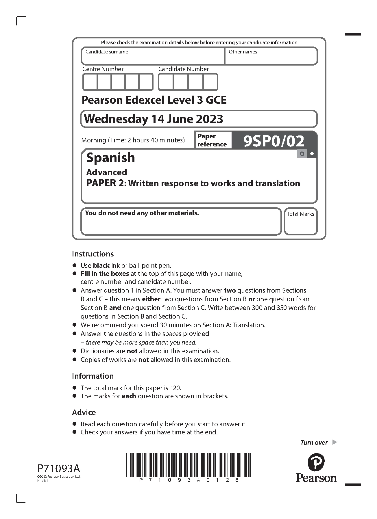 PEARSON EDEXCEL A LEVEL Spanish PAPER 2 2023 QUESTION PAPER (9SP0/02: Written response to works and translation). PEARSON EDEXCEL A LEVEL Spanish PAPER 2 2023 QUESTION PAPER (9SP0/02: Written response to works and translation) Pearson Edexcel A and AS Papers and Mark Schemes