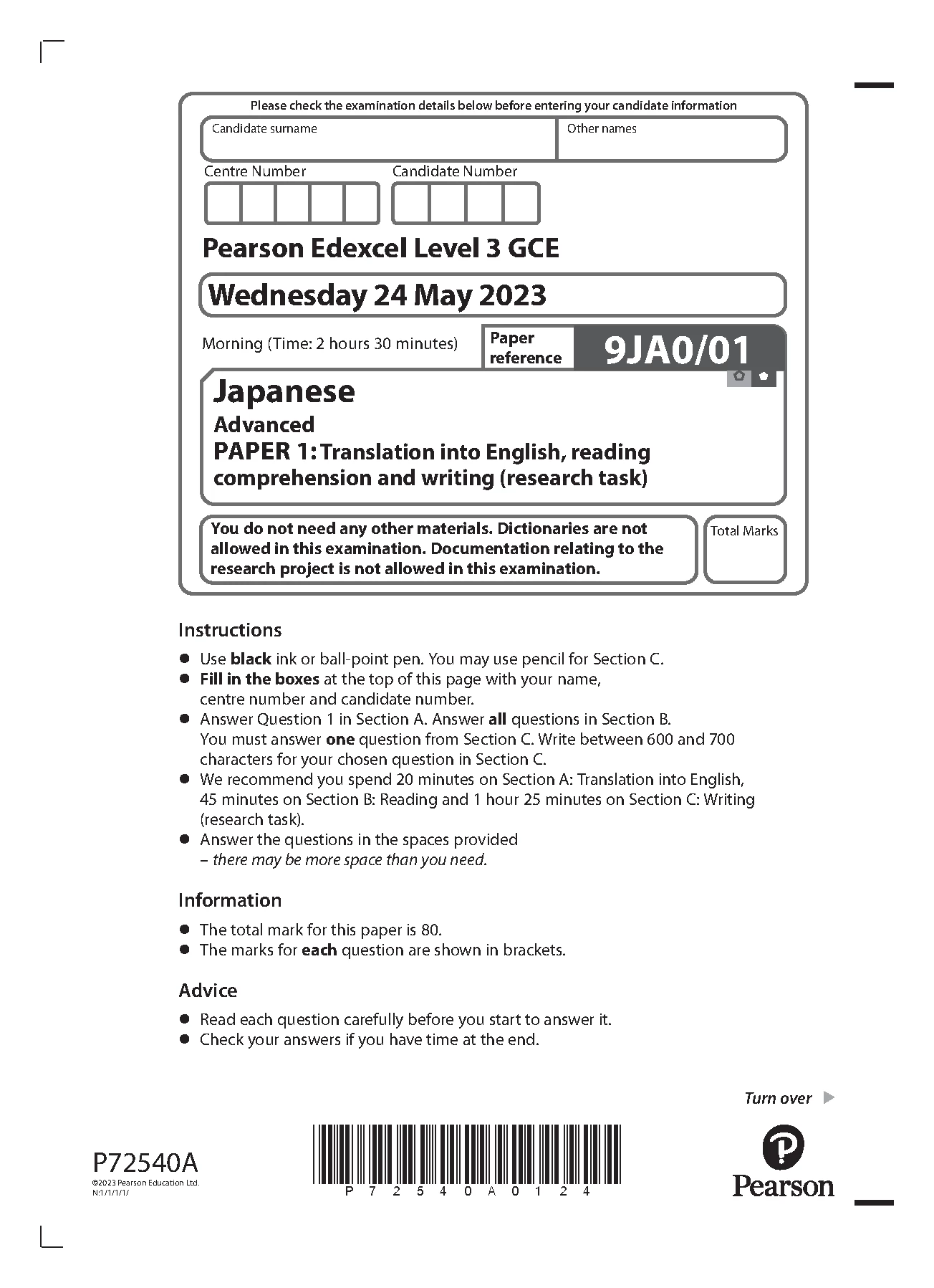 PEARSON EDEXCEL A LEVEL Japanese PAPER 1 2023 QUESTION PAPER (9JA0/01: Translation into English, reading comprehension and writing (research task)). PEARSON EDEXCEL A LEVEL Japanese PAPER 1 2023 QUESTION PAPER (9JA0/01: Translation into English, reading comprehension and writing (research task)) Pearson Edexcel A and AS Papers and Mark Schemes