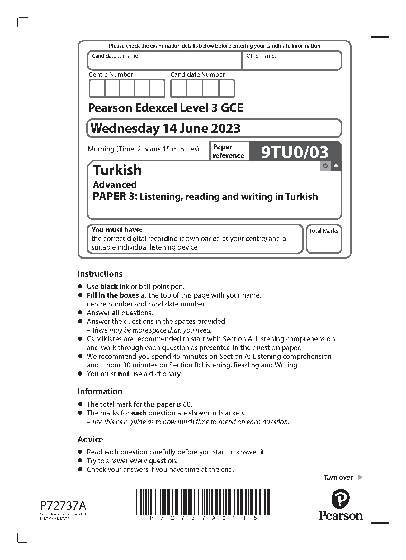 pearson edexcel a level turkish paper 3 2023 question paper (9tu0/03: listening, reading and writing in turkish). downlo...