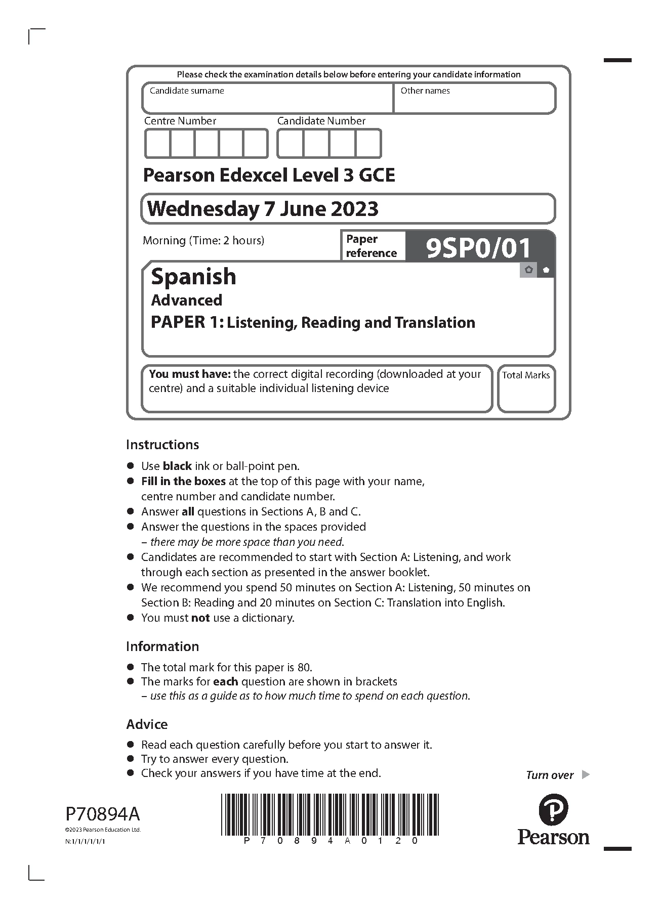 PEARSON EDEXCEL A LEVEL Spanish PAPER 1 2023 QUESTION PAPER (9SP0/01: Listening, Reading and Translation). PEARSON EDEXCEL A LEVEL Spanish PAPER 1 2023 QUESTION PAPER (9SP0/01: Listening, Reading and Translation) Pearson Edexcel A and AS Papers and Mark Schemes