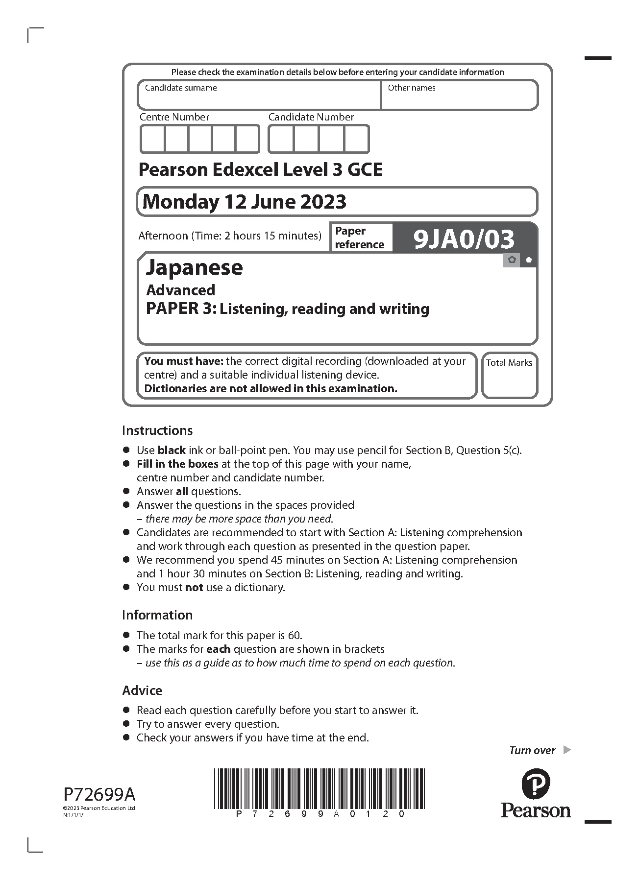 pearson edexcel a level japanese paper 3 2023 question paper (9ja0/03: listening, reading and writing). download officia...