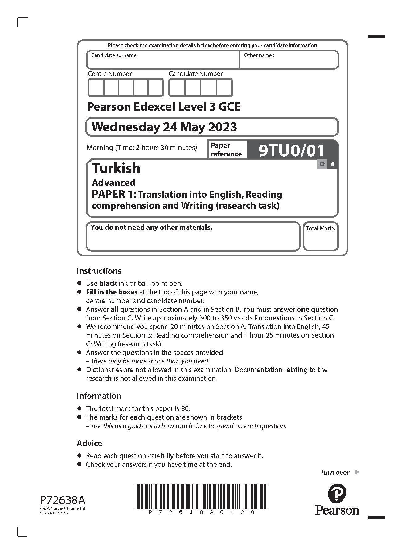 PEARSON EDEXCEL A LEVEL Turkish PAPER 1 2023 QUESTION PAPER (9TU0/01: Translation into English, Reading comprehension and Writing (research task)). PEARSON EDEXCEL A LEVEL Turkish PAPER 1 2023 QUESTION PAPER (9TU0/01: Translation into English, Reading comprehension and Writing (research task)) Pearson Edexcel A and AS Papers and Mark Schemes