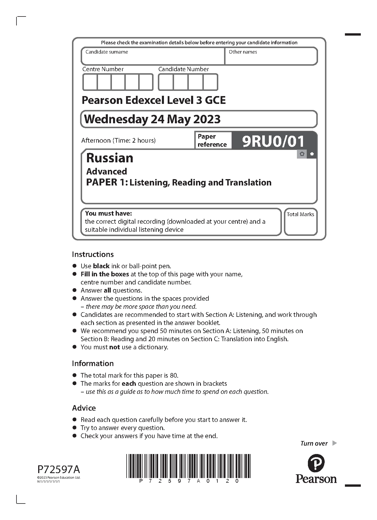 PEARSON EDEXCEL A LEVEL Russian PAPER 1 2023 QUESTION PAPER (9RU0/01: Listening, Reading and Translation). PEARSON EDEXCEL A LEVEL Russian PAPER 1 2023 QUESTION PAPER (9RU0/01: Listening, Reading and Translation) Pearson Edexcel A and AS Papers and Mark Schemes