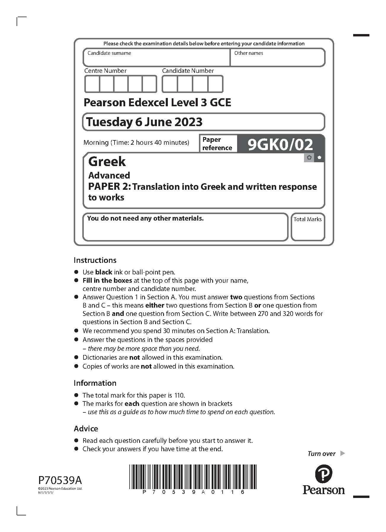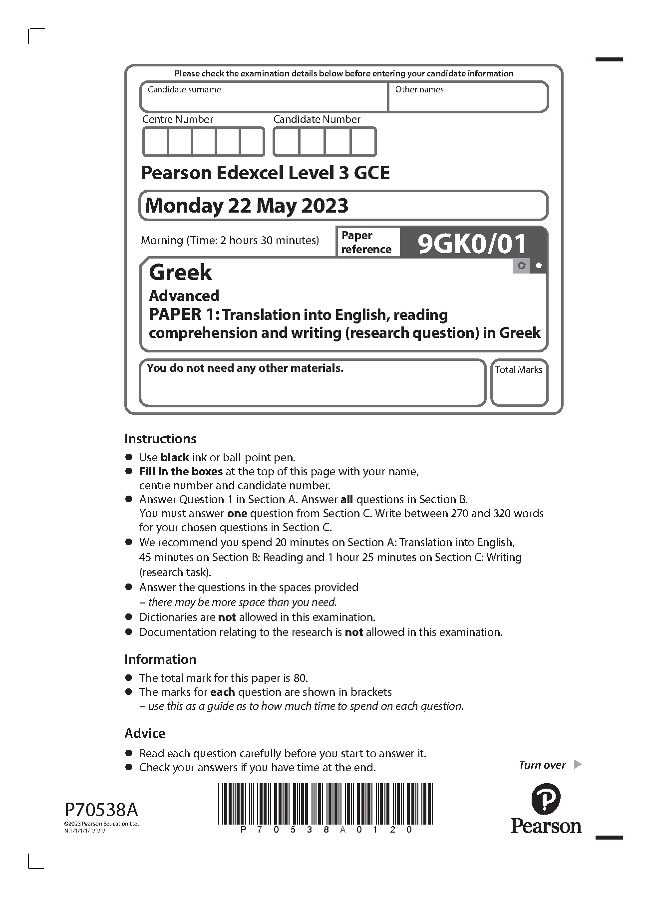 PEARSON EDEXCEL A LEVEL Greek PAPER 1 2023 QUESTION PAPER (9GK0/01: Translation into English, reading comprehension and writing (research question) in Greek). PEARSON EDEXCEL A LEVEL Greek PAPER 1 2023 QUESTION PAPER (9GK0/01: Translation into English, reading comprehension and writing (research question) in Greek) Pearson Edexcel A and AS Papers and Mark Schemes