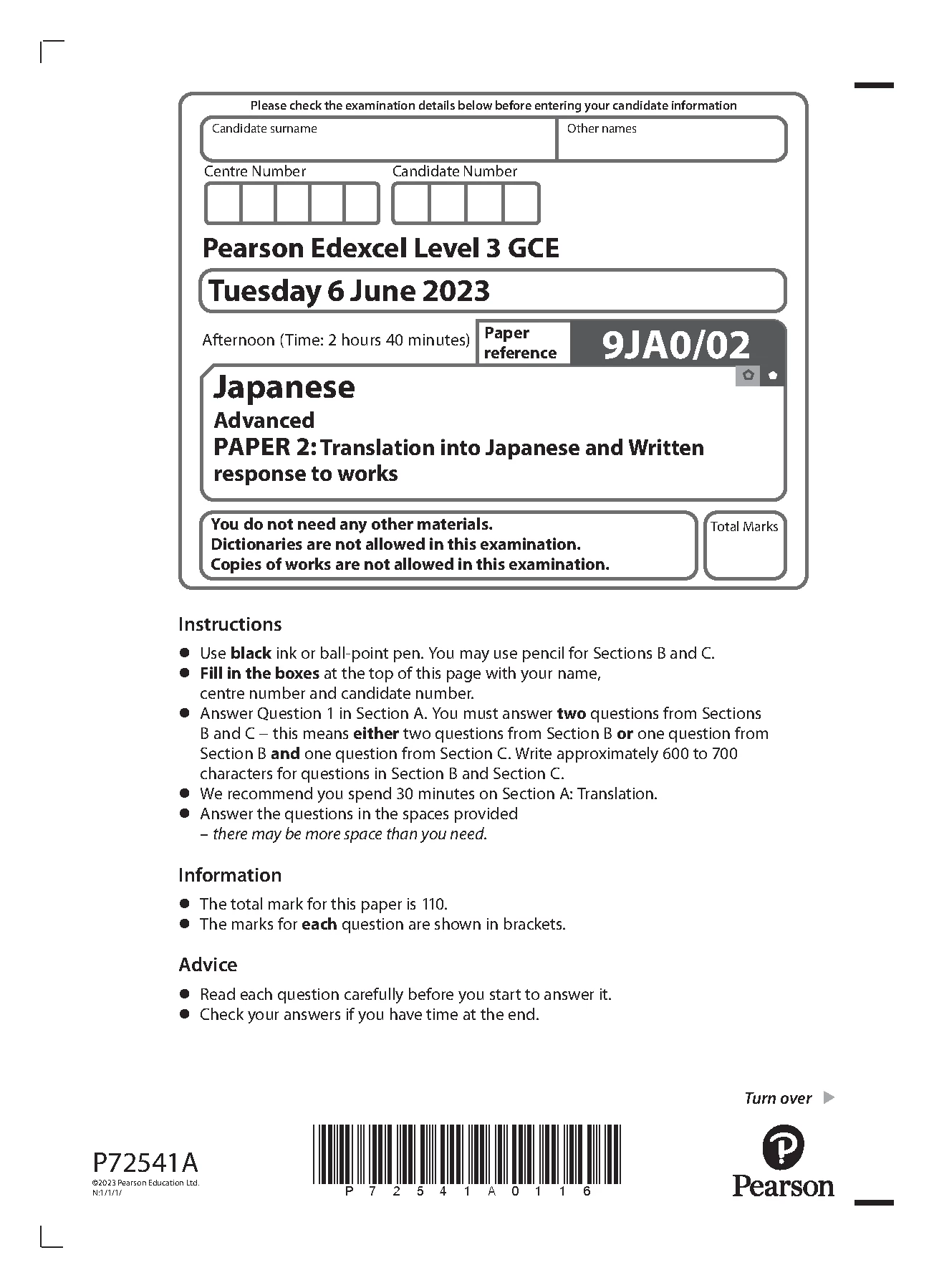 PEARSON EDEXCEL A LEVEL Japanese PAPER 2 2023 QUESTION PAPER (9JA0/02: Translation into Japanese and Written response to works). PEARSON EDEXCEL A LEVEL Japanese PAPER 2 2023 QUESTION PAPER (9JA0/02: Translation into Japanese and Written response to works) Pearson Edexcel A and AS Papers and Mark Schemes