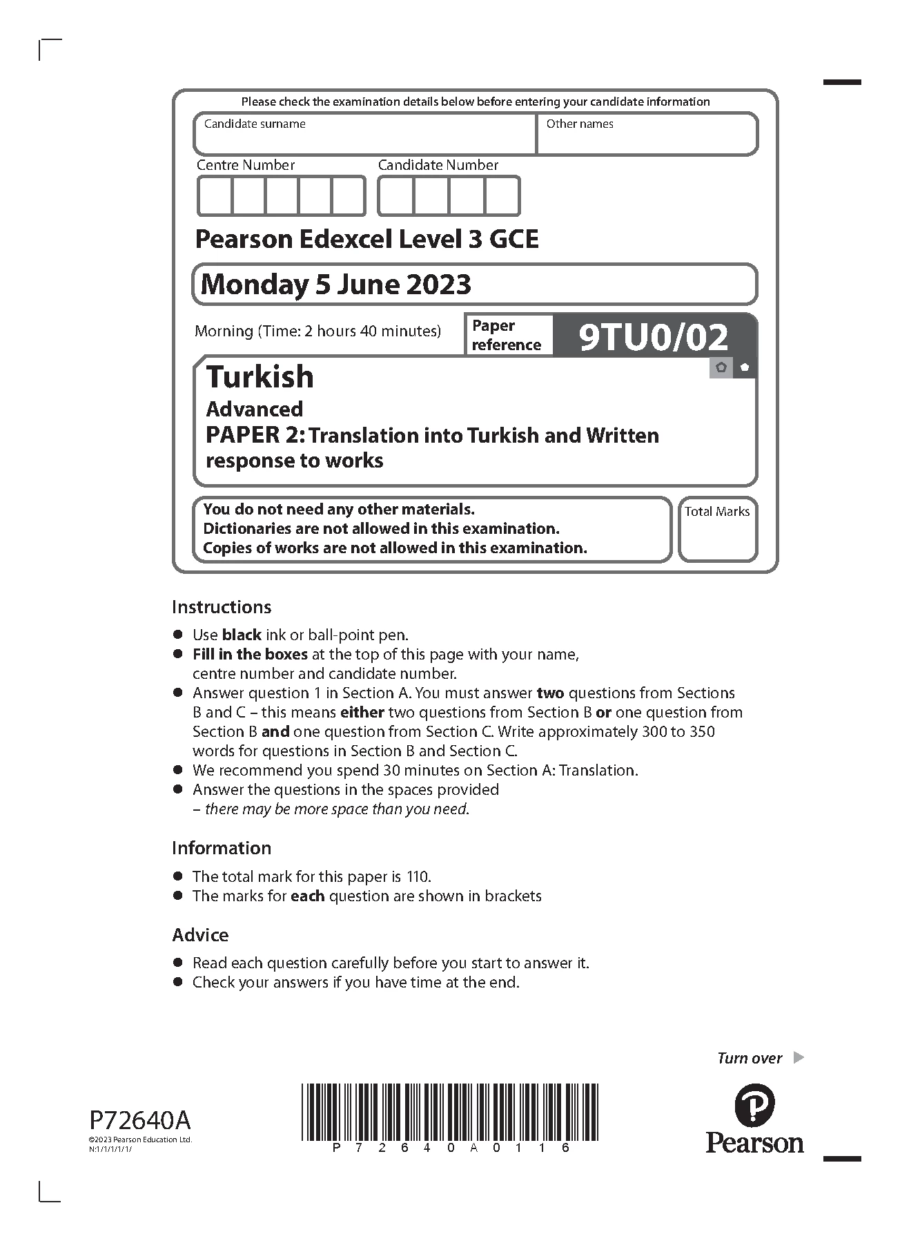 PEARSON EDEXCEL A LEVEL Turkish PAPER 2 2023 QUESTION PAPER (9TU0/02: Translation into Turkish and Written response to works). PEARSON EDEXCEL A LEVEL Turkish PAPER 2 2023 QUESTION PAPER (9TU0/02: Translation into Turkish and Written response to works) Pearson Edexcel A and AS Papers and Mark Schemes