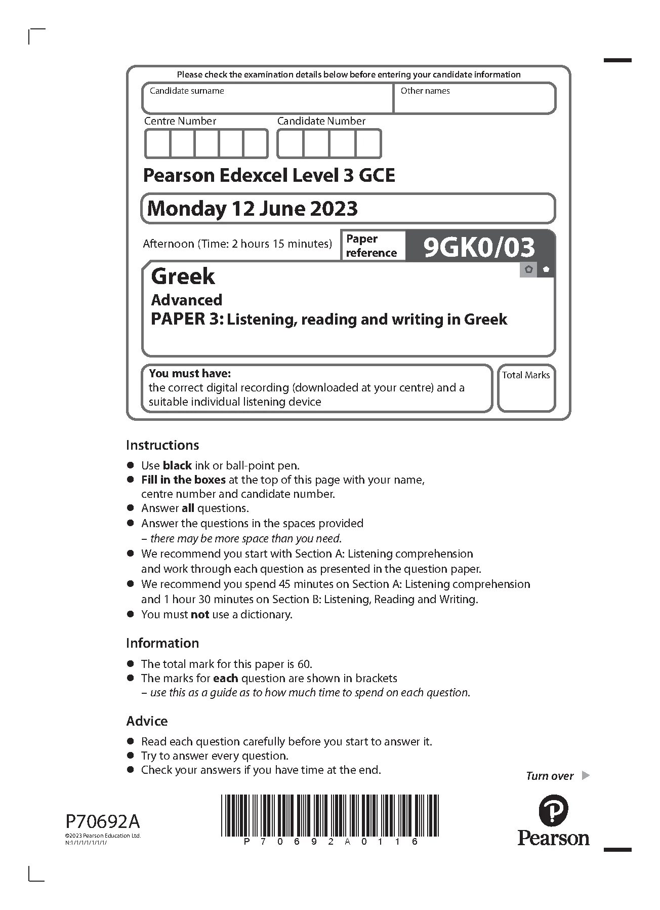 pearson edexcel a level greek paper 3 2023 question paper (9gk0/03: listening, reading and writing in greek). download o...