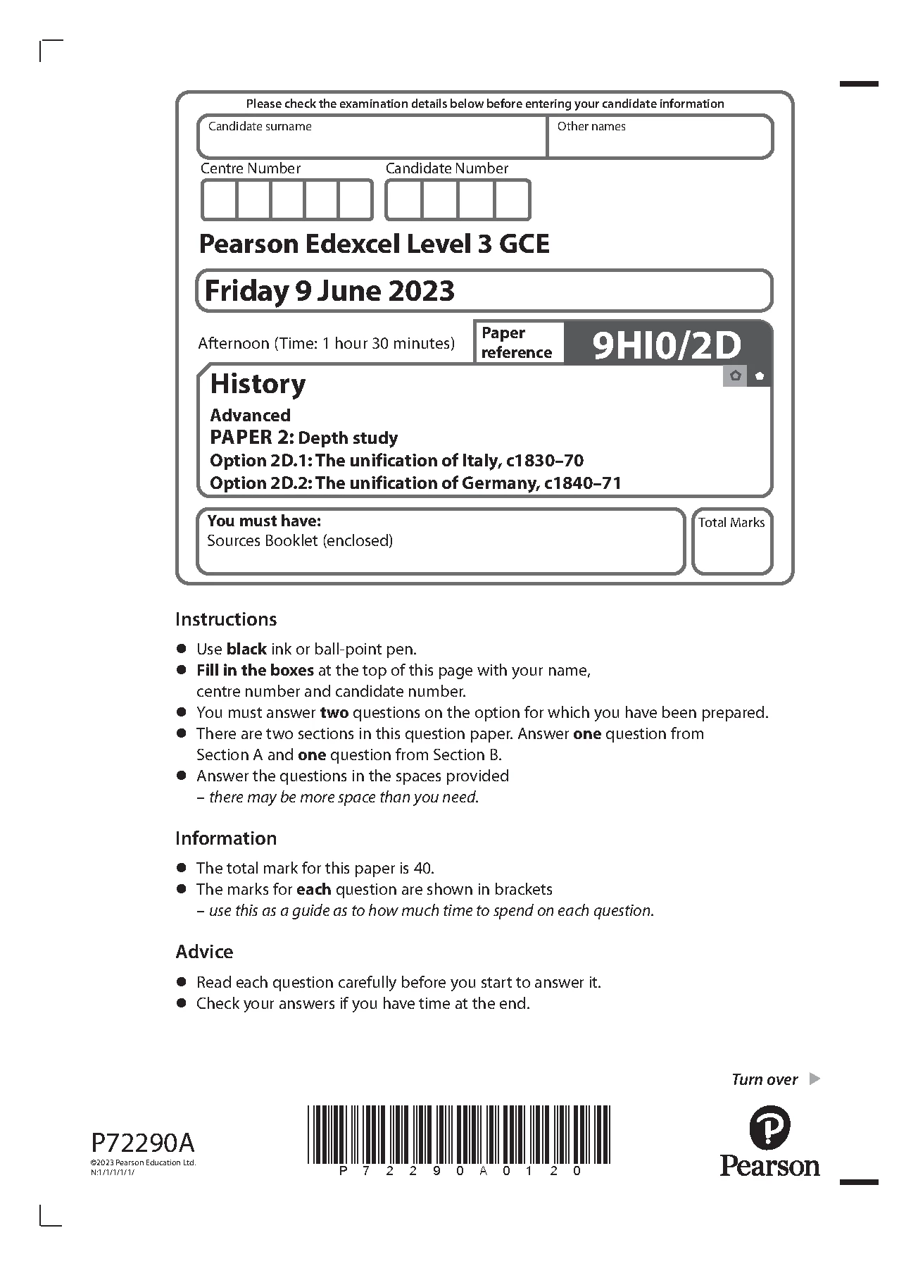 PEARSON EDEXCEL A LEVEL History PAPER 2 2023 QUESTION PAPER (9HI0/2D: Option 2D.1: The unification of Italy, c1830–70 & Option 2D.2: The unification of Germany, c1840–71). PEARSON EDEXCEL A LEVEL History PAPER 2 2023 QUESTION PAPER (9HI0/2D: Option 2D.1: The unification of Italy, c1830–70 & Option 2D.2: The unification of Germany, c1840–71) Pearson Edexcel A and AS Papers and Mark Schemes