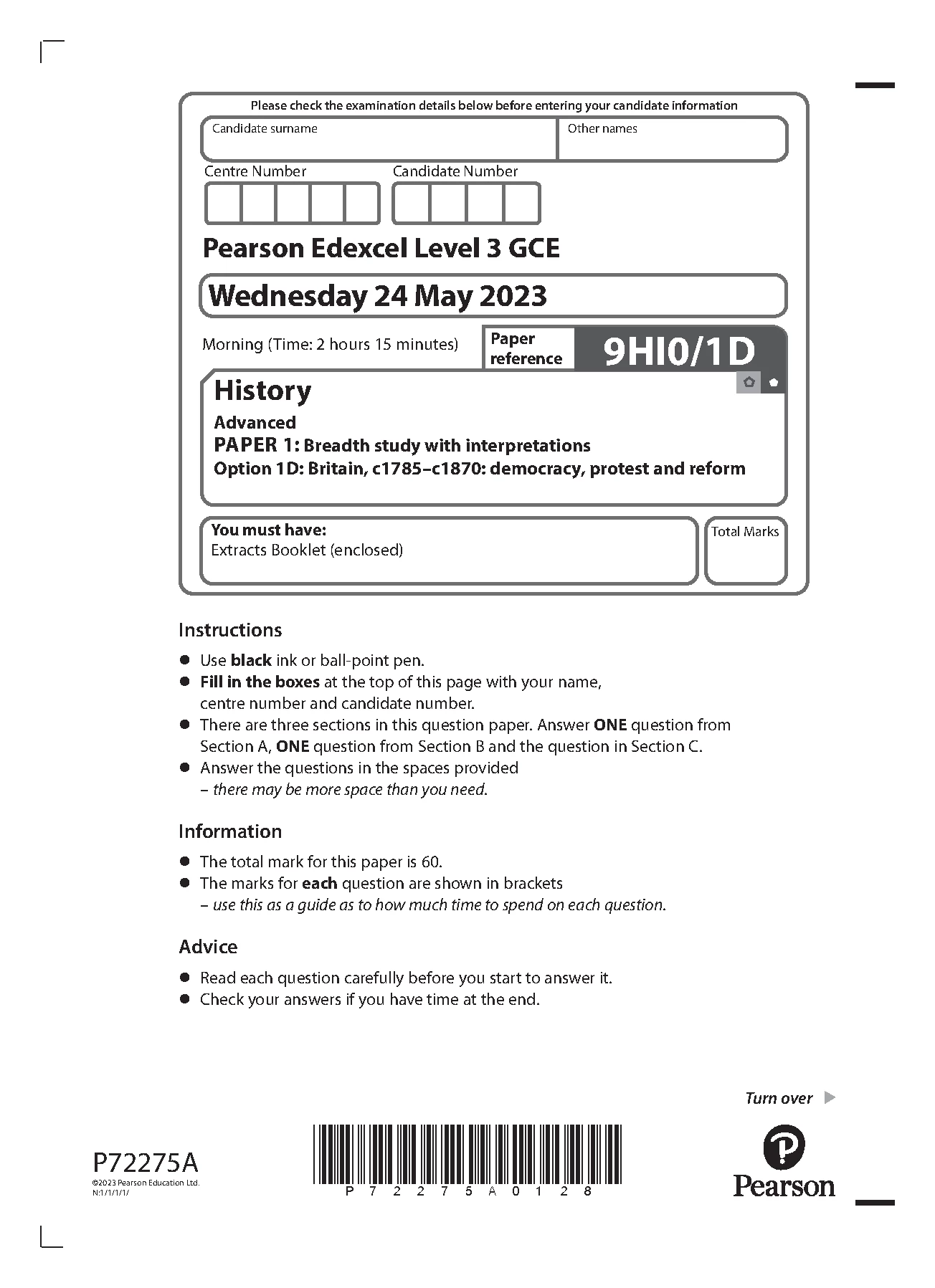 PEARSON EDEXCEL A LEVEL History PAPER 1 2023 QUESTION PAPER (9HI0/1D: Britain, c1785–c1870: democracy, protest and reform). PEARSON EDEXCEL A LEVEL History PAPER 1 2023 QUESTION PAPER (9HI0/1D: Britain, c1785–c1870: democracy, protest and reform) Pearson Edexcel A and AS Papers and Mark Schemes
