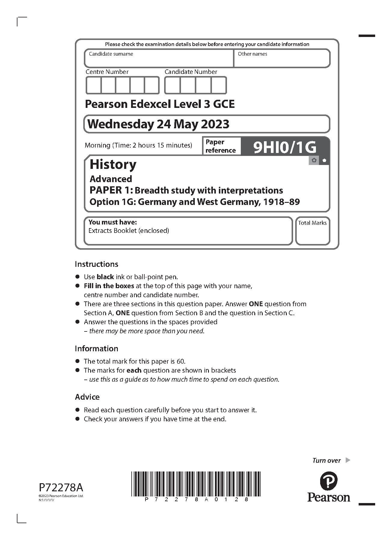 PEARSON EDEXCEL A LEVEL History PAPER 1 2023 QUESTION PAPER (9HI0/1G: Germany and West Germany, 1918–89). PEARSON EDEXCEL A LEVEL History PAPER 1 2023 QUESTION PAPER (9HI0/1G: Germany and West Germany, 1918–89) Pearson Edexcel A and AS Papers and Mark Schemes
