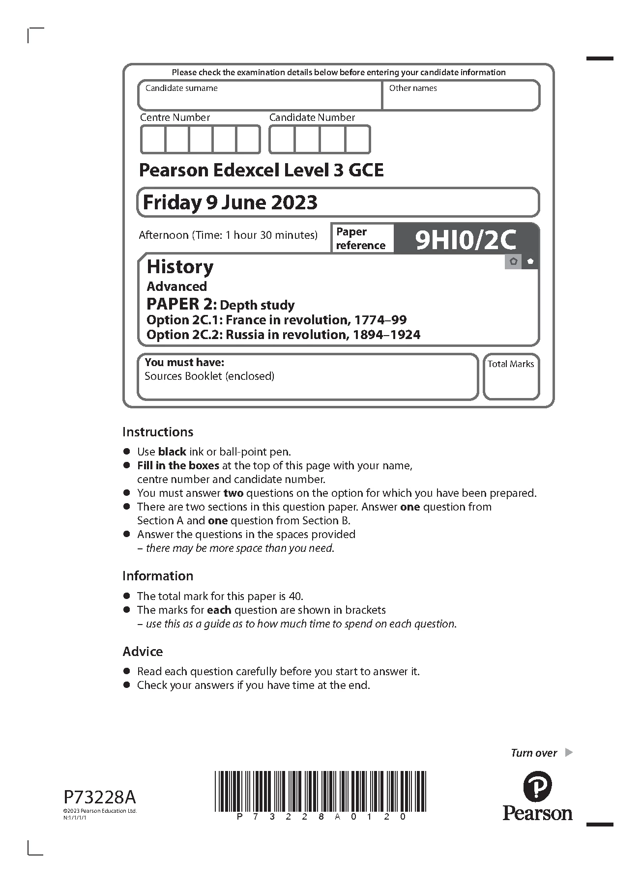 PEARSON EDEXCEL A LEVEL History PAPER 2 2023 QUESTION PAPER (9HI0/2C: Option 2C.1: France in revolution, 1774–99 & Option 2C.2: Russia in revolution, 1894–1924). PEARSON EDEXCEL A LEVEL History PAPER 2 2023 QUESTION PAPER (9HI0/2C: Option 2C.1: France in revolution, 1774–99 & Option 2C.2: Russia in revolution, 1894–1924) Pearson Edexcel A and AS Papers and Mark Schemes
