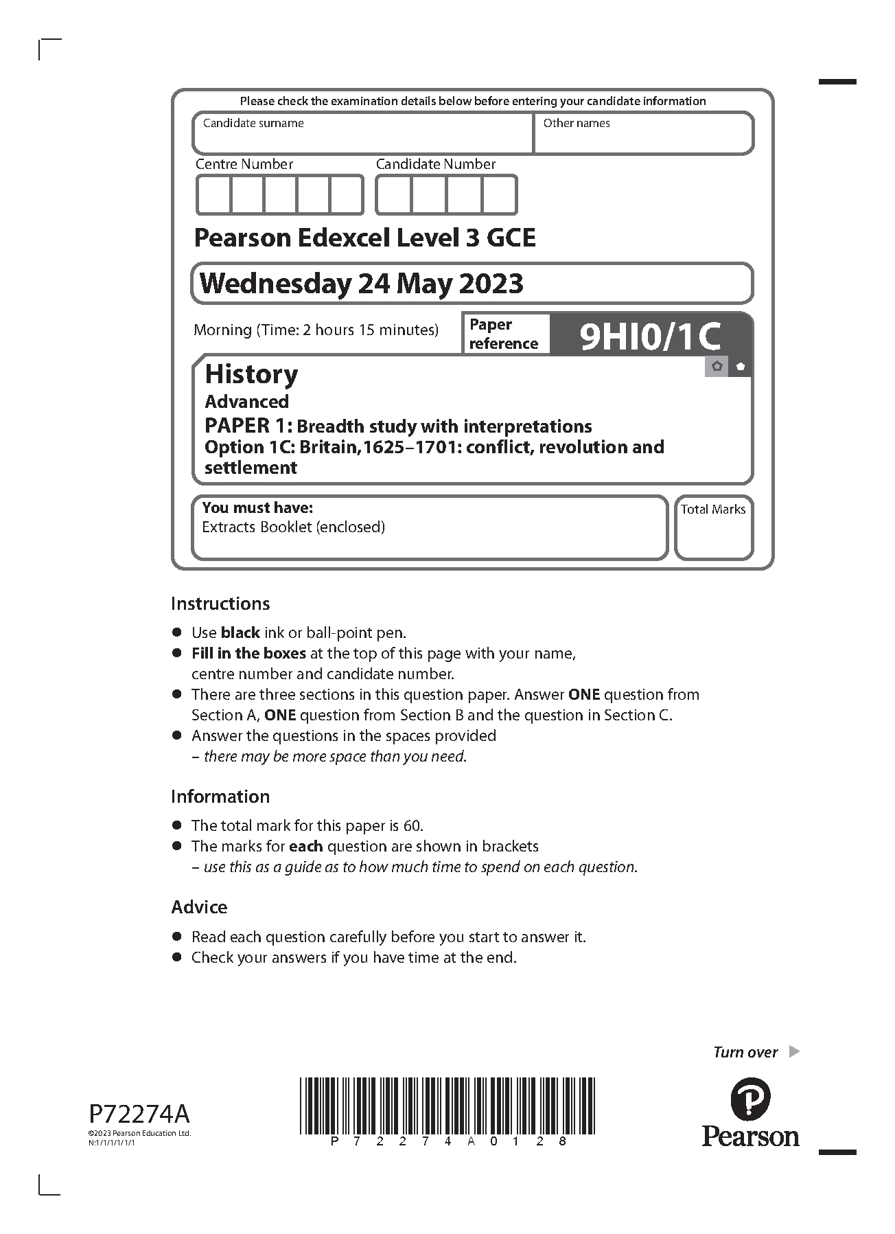 PEARSON EDEXCEL A LEVEL History PAPER 1 2023 QUESTION PAPER (9HI0/1C: Britain,1625–1701: conflict, revolution and settlement). PEARSON EDEXCEL A LEVEL History PAPER 1 2023 QUESTION PAPER (9HI0/1C: Britain,1625–1701: conflict, revolution and settlement) Pearson Edexcel A and AS Papers and Mark Schemes