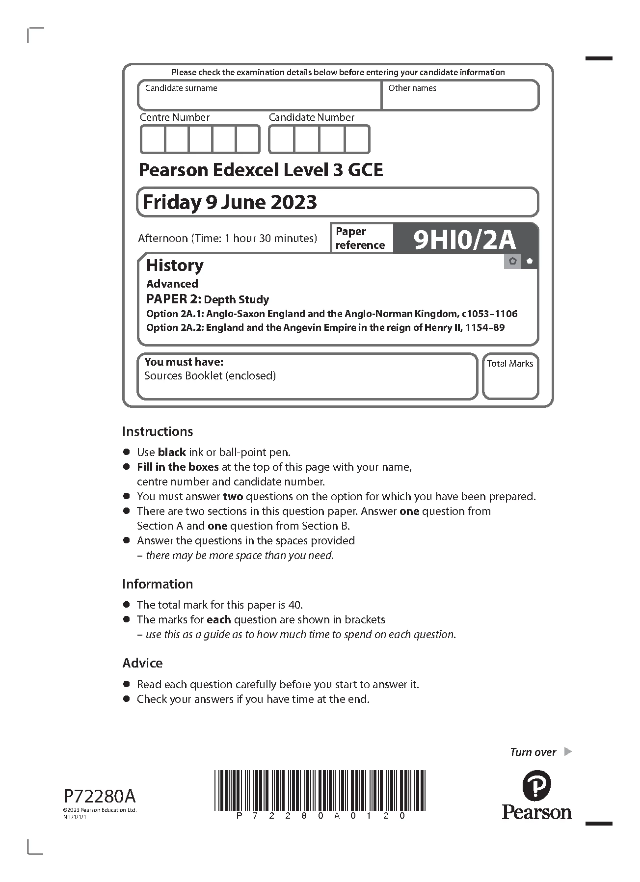 PEARSON EDEXCEL A LEVEL History PAPER 2 2023 QUESTION PAPER (9HI0/2A: Option 2A.1: Anglo-Saxon England and the Anglo-Norman Kingdom, c1053–1106 & Option 2A.2: England and the Angevin Empire in the reign of Henry II, 1154–89). PEARSON EDEXCEL A LEVEL History PAPER 2 2023 QUESTION PAPER (9HI0/2A: Option 2A.1: Anglo-Saxon England and the Anglo-Norman Kingdom, c1053–1106 & Option 2A.2: England and the Angevin Empire in the reign of Henry II, 1154–89) Pearson Edexcel A and AS Papers and Mark Schemes